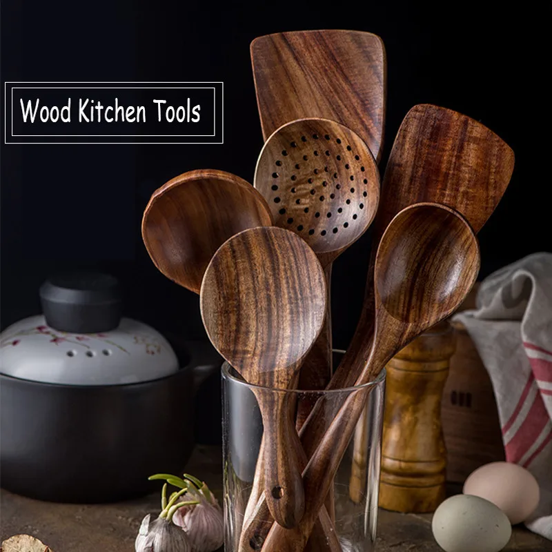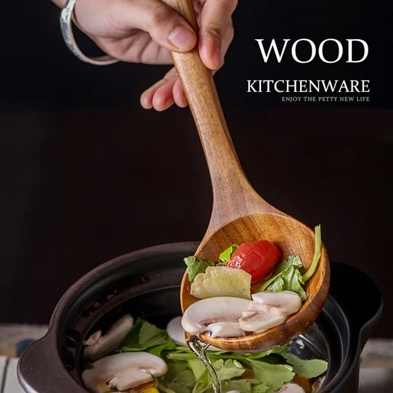 Деревянная Тиковая ложка, набор ковшей, деревянные кухонные инструменты, столовые приборы, ложка, рисовые дуршлаги, ложки с длинной ручкой