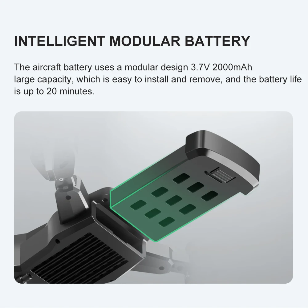 • Срок службы батареи 20ins: Аккумулятор самолета имеет модульную конструкцию 3,7 в, 2000 мАч, которая легко устанавливается и снимается, а срок службы батареи составляет до 20 минут.