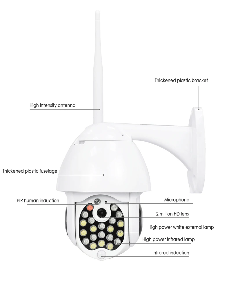 Поддержка интеллигентая (ый) отслеживание, сигнализация, запись, аудио запись, воспроизведение видео, система двухсторонней голосовой связи, вверх и вниз, простота в использовании, облачное хранилище, звук и светильник, сигнализация, мониторинг в реальном времени, мобильный/звуковой сигнал, нажатием одной кнопки сброса проводные сети, мобильный телефон фото/видео, Точка беспроводного доступа соединения.