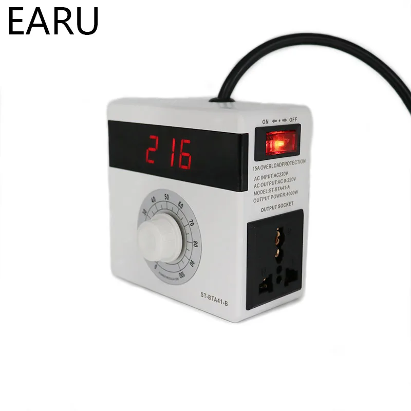 Катиус: устройство можно настроить только при мощности не менее 20 Вт! Название продукта: однофазный электронный регулятор напряжения Модель продукта: ST-BTA41-B (ручка) Примечание: черная модель не имеет вольтметра Входное напряжение: переменный ток 0-220 В Выходное напряжение: 10-220 В переменного тока, регулируемое (вольтметр не работает, когда выходное напряжение ниже 5 В) Пиковая мощность: 4000 Вт (максимальная мощность нагрузки 2000 Вт) Диапазон регулирования напряжения: 0-220 В переменного тока, плавная регулировка (с условиями нагрузки) для снижения давления до 0 В, повышение до 10 в Номинальный ток: 9 А Пиковый ток: 18А Характеристики продукта: Нулевая задержка, Нулевая задержка, схема поглощения пикового напряжения эффективно защищает Тиристор высокой мощности Мульти-защита от скачков напряжения, пиковых нагрузок и радиоуправляемого поглощения Размер изделия: 10 * в длину, 10 * в ширину и 5 см в высоту