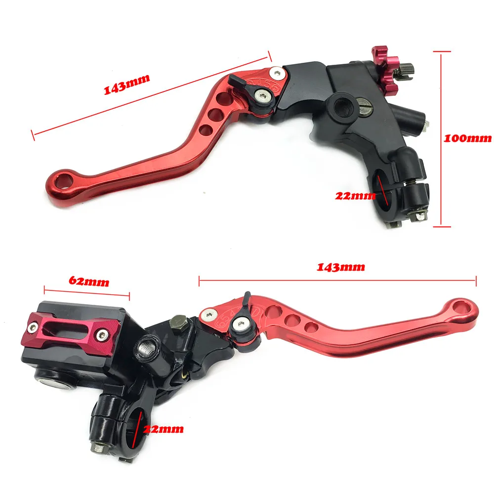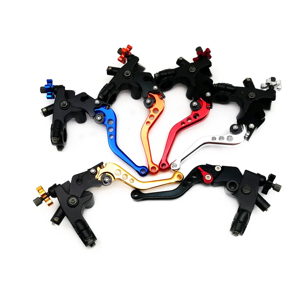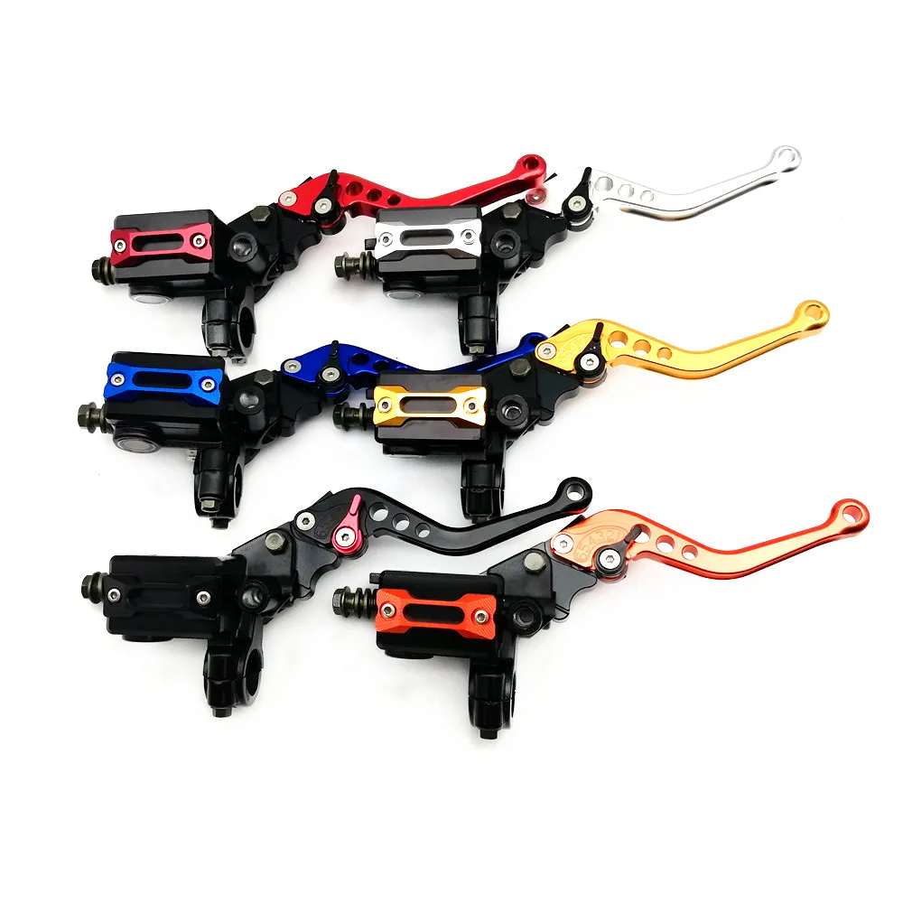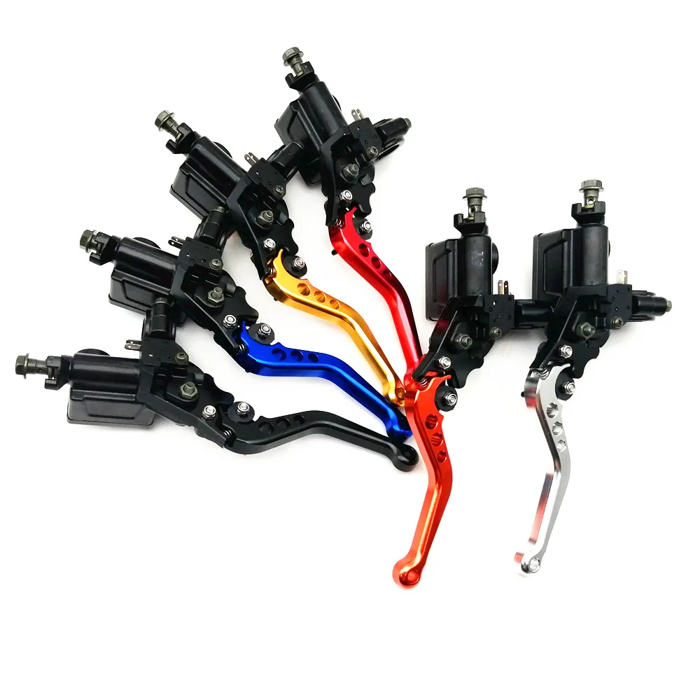 Рычаг гидравлического тормоза сцепления для мотоцикла Материал: ЧПУ из алюминиевого сплава Цвет: серебристый, красный, оранжевый, синий, черный, золотой Универсальный стандартный 7/8 " (22 мм) Главный тормозной цилиндр для переднего колеса & Окунь сцепления с регулируемыми рычагами и полным набором резервуара жидкости. Рычаги изготовлены из алюминия и анодированы в том же цвете, что и колпачок Резервуара тормозной жидкости. Алюминиевый корпус, поршень изготовлен из специальной нержавеющей стали. Регулируемые рычаги. Приспособление: большинство мотоциклов, рычаг диаметром 22 мм Пожалуйста, убедитесь, что размер подходит для вашего велосипеда.