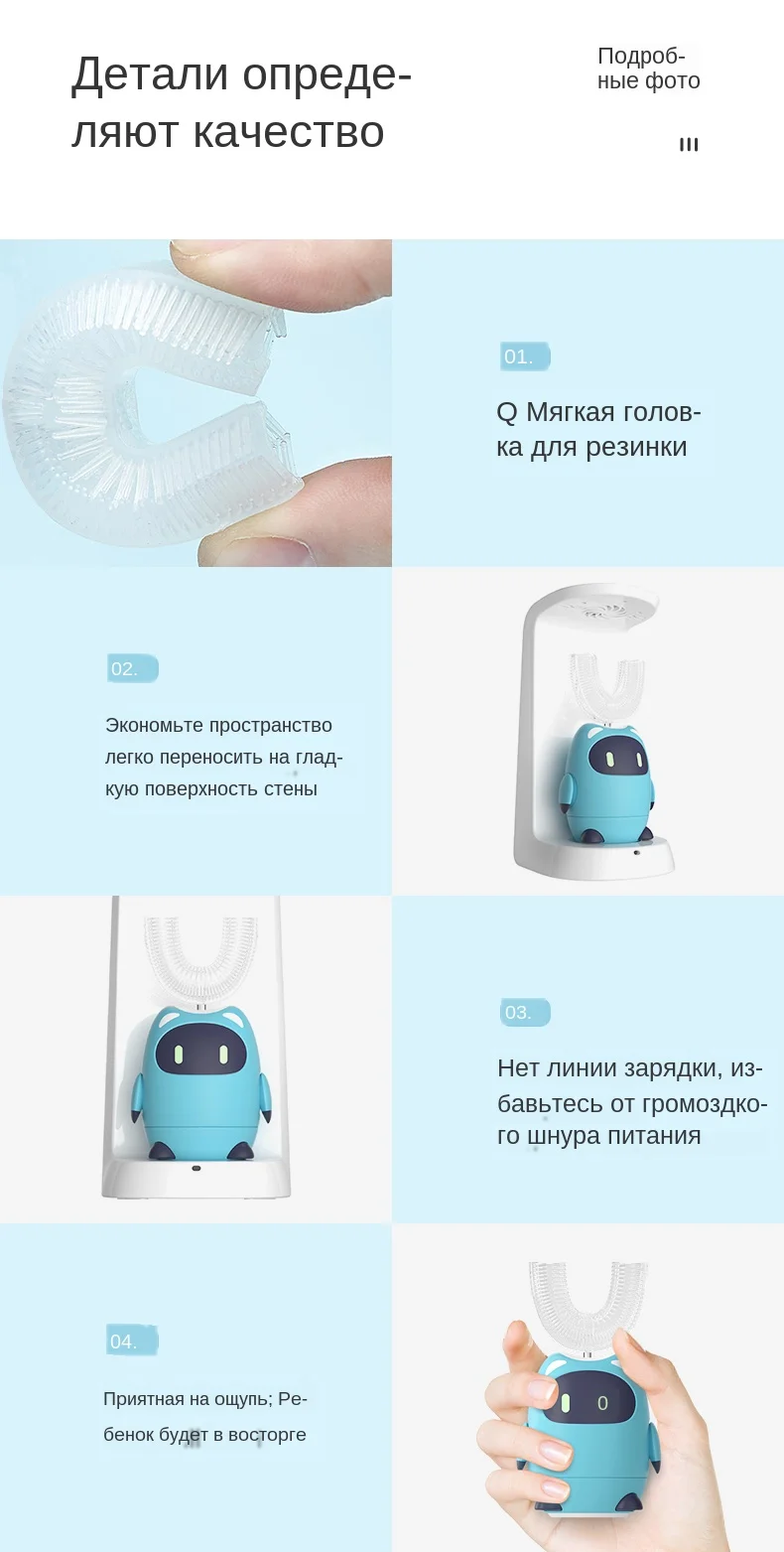 Тип: умная u-образная звуковая Детская электрическая зубная щетка Цвет: розовый и синий Тип: HOME & PLUS Головка щетки: Пищевая силиконовая зубная щетка Электрический ток: 400 мА Напряжение: 3,7 В Частота вибрации: 5000-15000 раз/мин Класс водонепроницаемости: IPX7 электрическая зубная щетка Возраст: 2-6 и 6-12 лет Время зарядки: 1-2 часа Источник питания: usb-зарядка зубной щетки Время работы в режиме ожидания: более 15 дней Вес изделия: 212 г Режим очистки: 3 режима Режим зарядки: магнитная Беспроводная зарядная зубная щетка для детей Особенность 1: автоматический стерилизованный ультрафиолетовым светильник Особенность 2: автоматическая сушка Особенность 3: настенный или портативный Обслуживание: Оптовая продажа