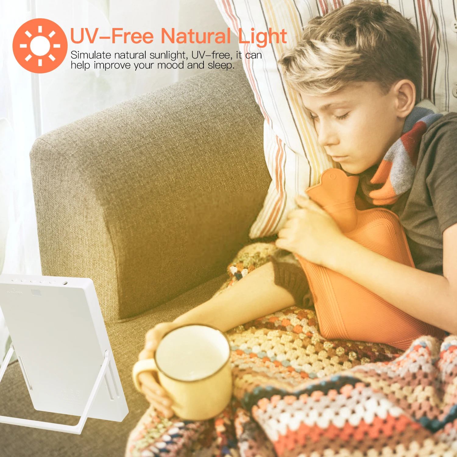 【 Естественное освещение без УФ-излучения:Терапии светильник доска можем имитировать натуральный Защита от солнца светильник, без ультрафиолетового излучения, которые обеспечивают безопасный и удобный светильник терапии, это может помочь улучшить ваше настроение и сна, держите ваш мозг проснулся и энергично. Чтобы помочь вам бороться с зимним блюзом, задержкой струи, сменной работой, бессонницей, сезонными переменами и лишением солнечного света. Идеально подходит для людей, которые живут и работают в помещении в течение длительного времени с небольшим воздействием солнечных лучей.