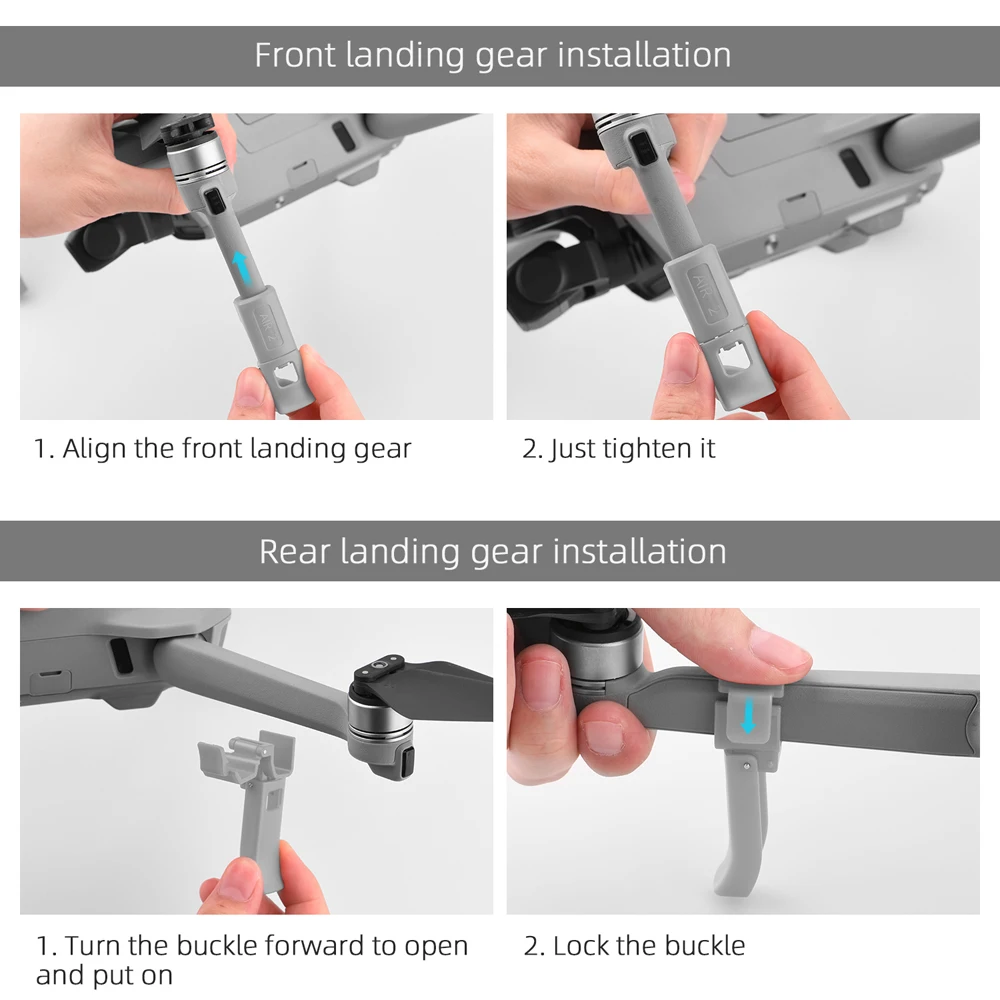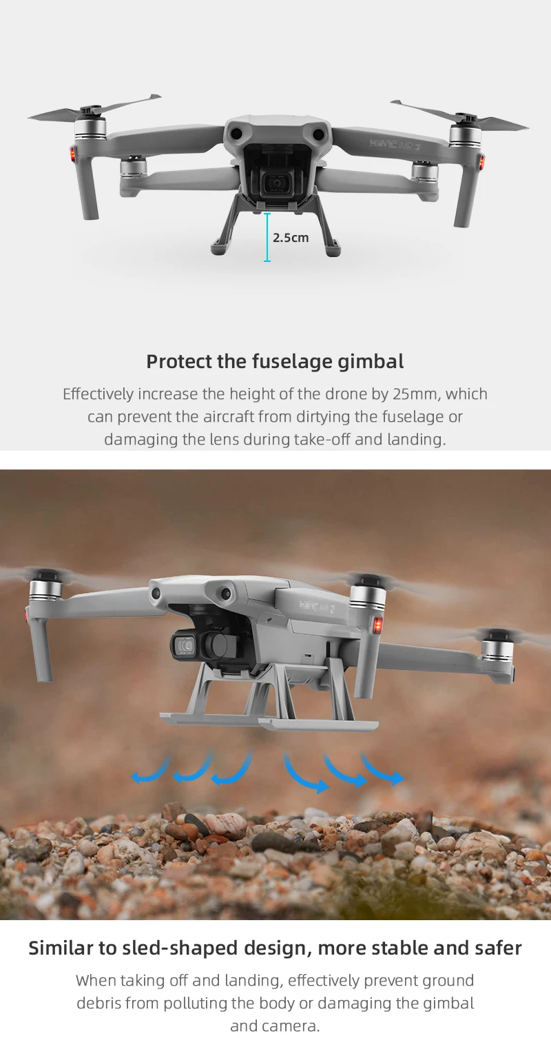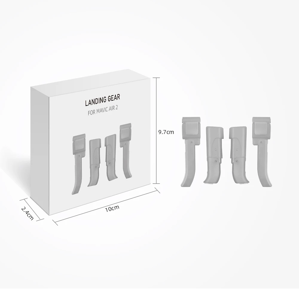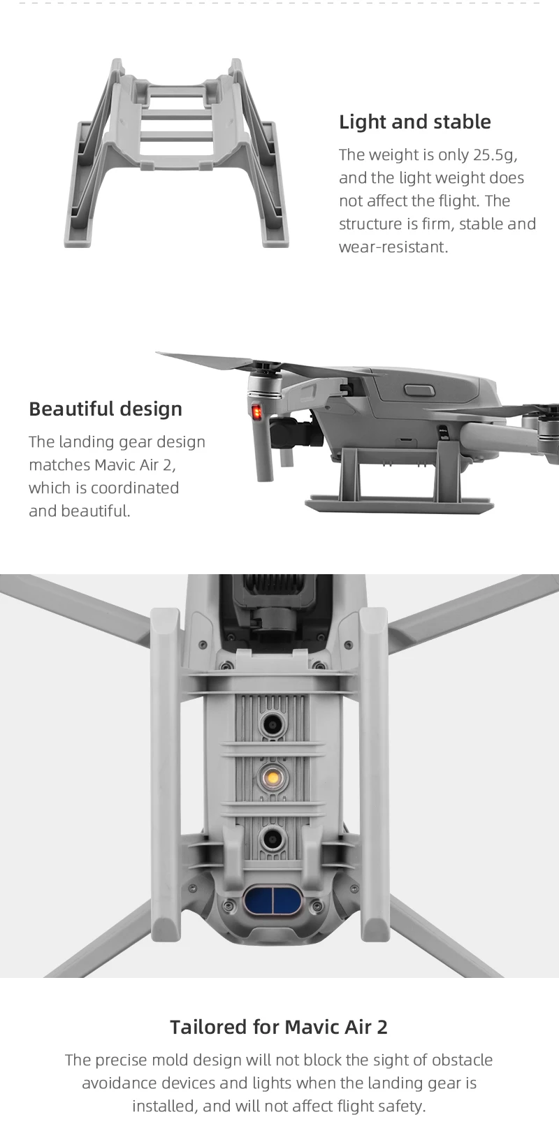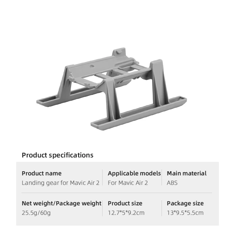 Особенность: 1. Изготовлен из высококачественного материала, прочный в использовании 2. Высота посадочного шасси эффективно увеличена на 18/22/35 мм, и он по-прежнему может взлетать и приземляться в неровной среде земли, которые могут избежать наземного мусора в самолете при посадке и взлете или повредить облачную платформу. 3. Быстрая разборка и полезная конструкция с защитой от размыкания. Описание: Материал: пластик Подходящие модели: для Mavic Air 2 Цвет: серый Вес нетто: 18,3 г Вес посылка: около 40 г Размер игрушки: 6*2,2*1,5 см (задний штатив), 5*1,6*1,6 см (передний штатив) Размер посылка: 10*9,7*2,2 см Комплектация: 1 комплект шасси