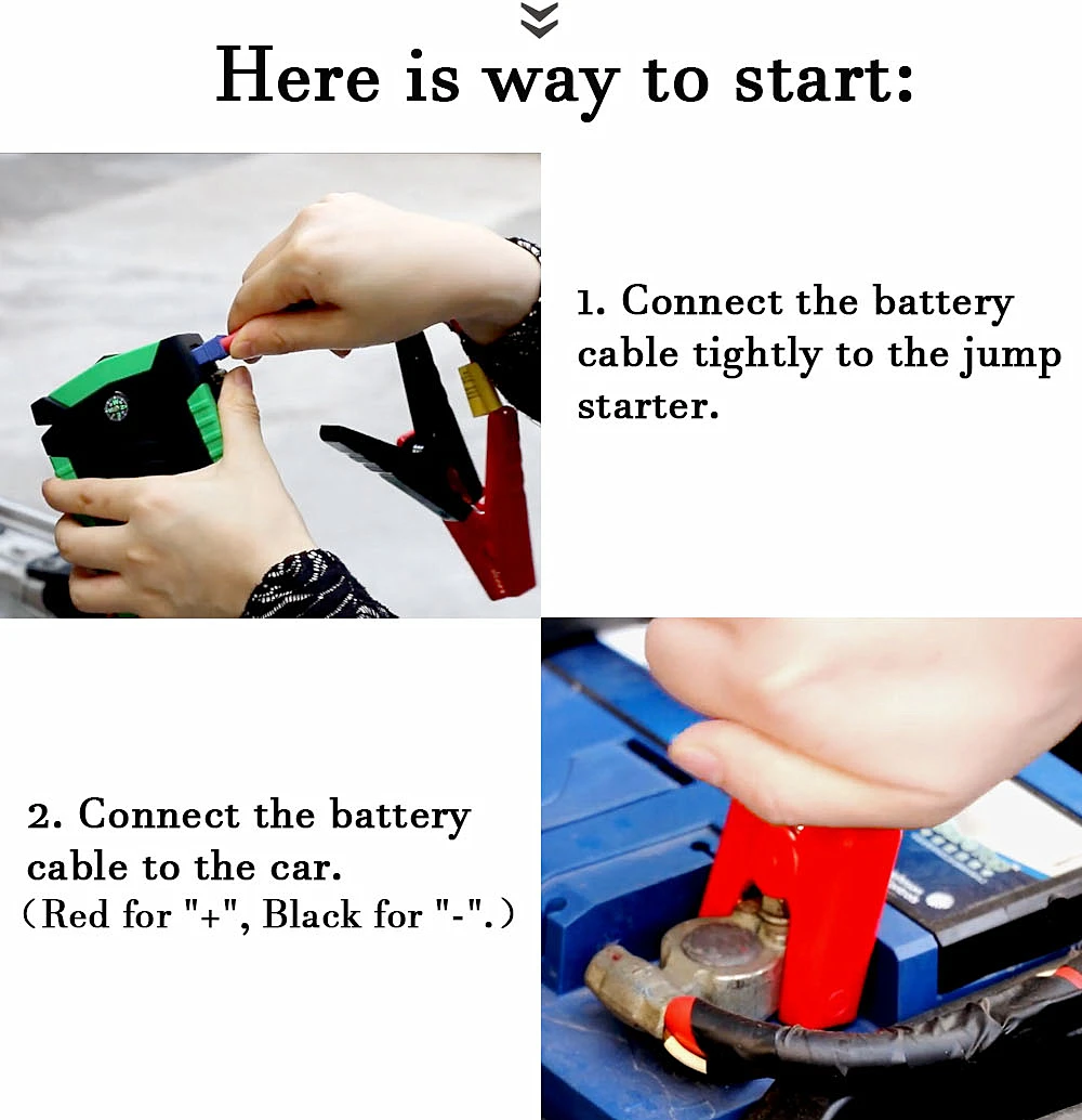 Внимание, пожалуйста: 1. Для вашей безопасности, пожалуйста, не разбирайте стартер скачка. После демонтажа самостоятельно, мы не будем обслуживать любые возникшие проблемы. 2. Перед запуском двигателя убедитесь, что пусковое устройство полностью заряжено. 3. Если стартер скачка не может начать в одно время. Повторите попытку через 30 секунд или дольше и начните медленнее.