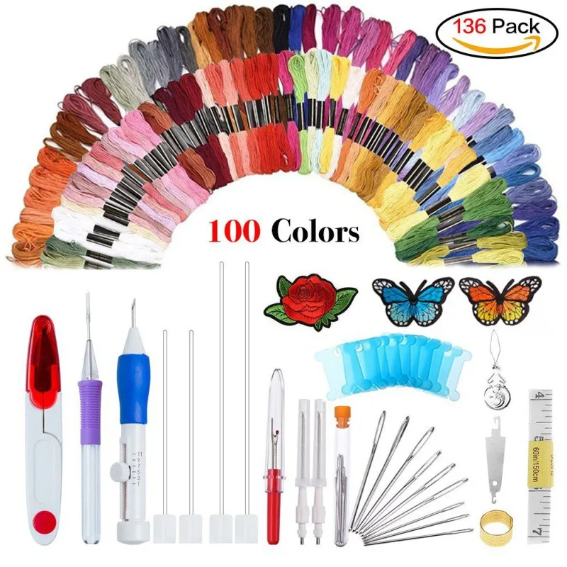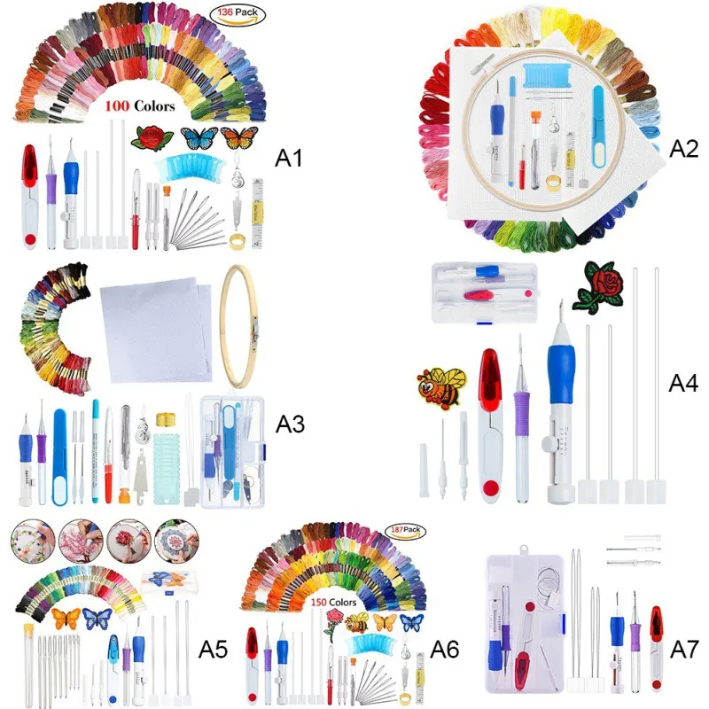 A6: 150 цветных нитей + 1 синяя ручка для вышивки (3 модели со съемной головкой) + 1 средство для удаления нитей + 1 бутылка вышитых игл (9 шт.) + 1 ножницы + 10 намоточных тарелок + 1 рулетка для измерения, 1 наперсток + 2 иглы + 4 направляющих резьбы + 1 Съемник резьбы + 4 вышитые наклейки