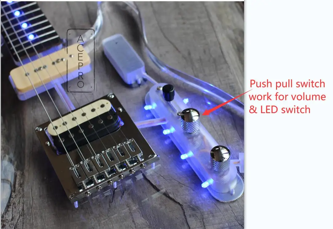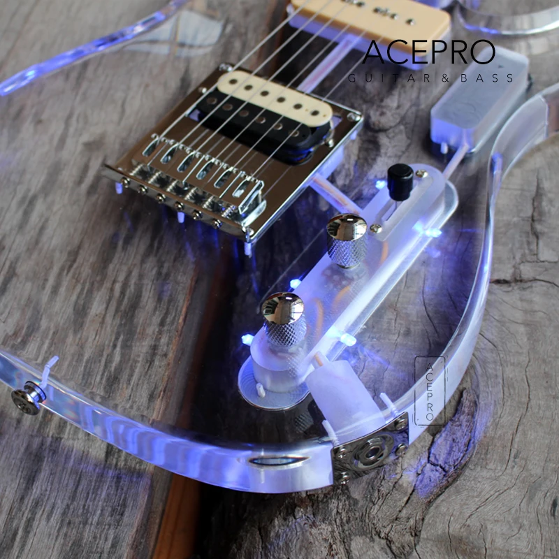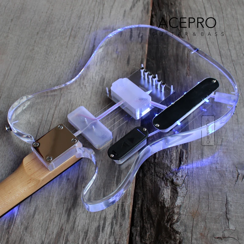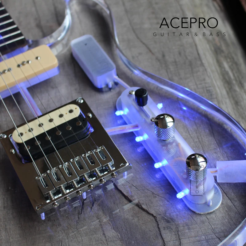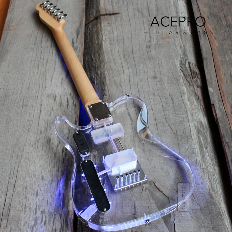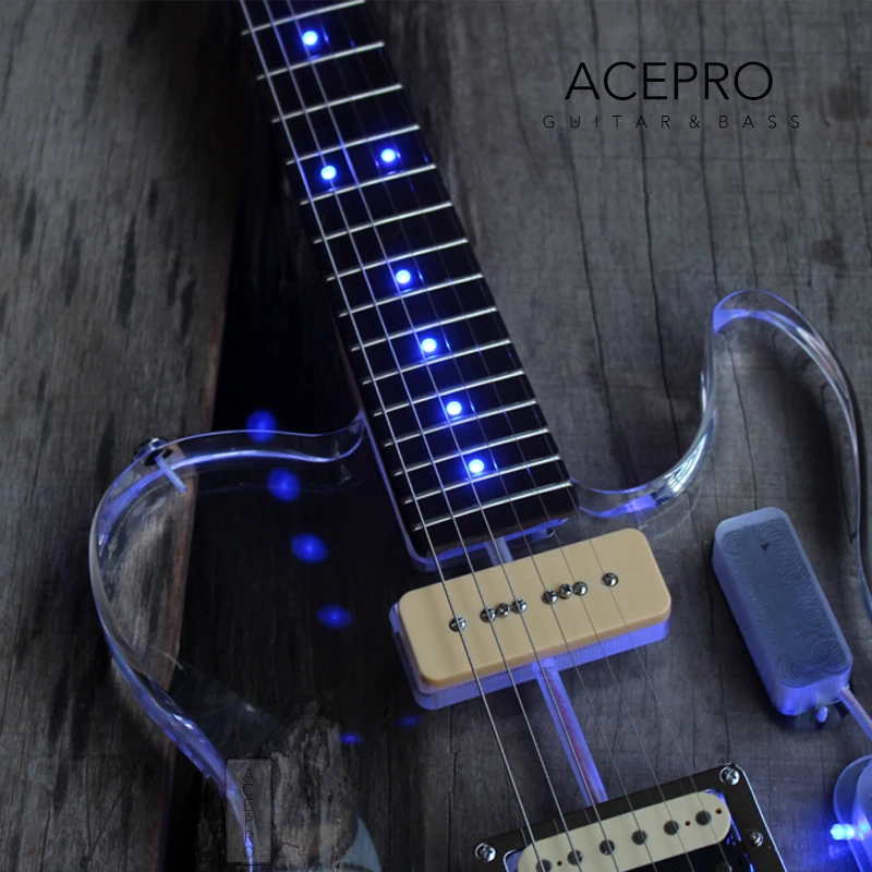 Электрическая гитара Acepro со светодиодной подсветкой и синим светодиодом s, акриловый корпус гитара с отделкой кристаллами, гриф из клена, гриф из розового дерева
