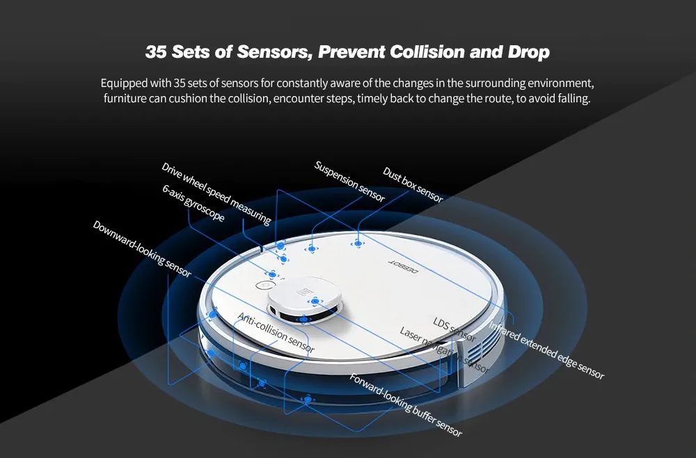 Оснащен 35 наборами датчиков для постоянного пробуждения изменений в окружающей среде, мебель может смягчить столкновение, столкнуться с шагами, своевременно вернуться, чтобы изменить маршрут, чтобы избежать падения.