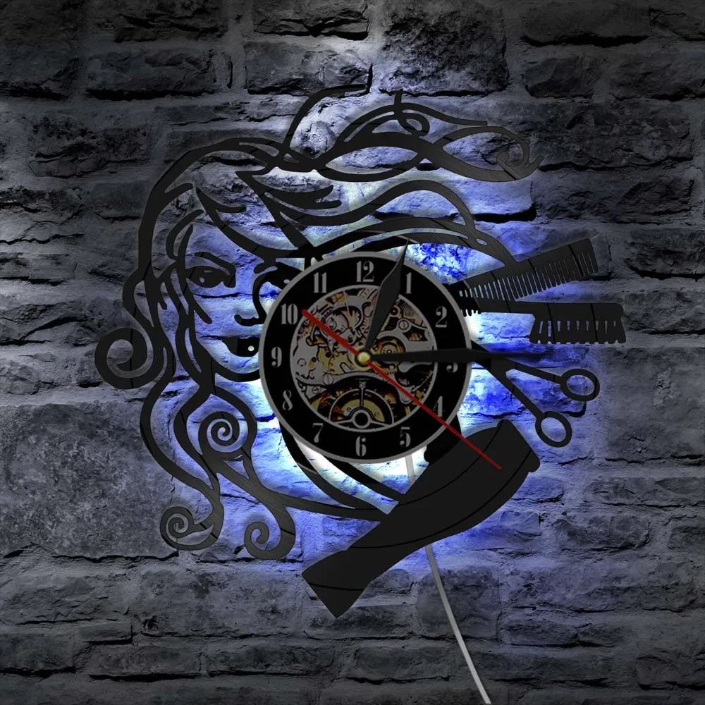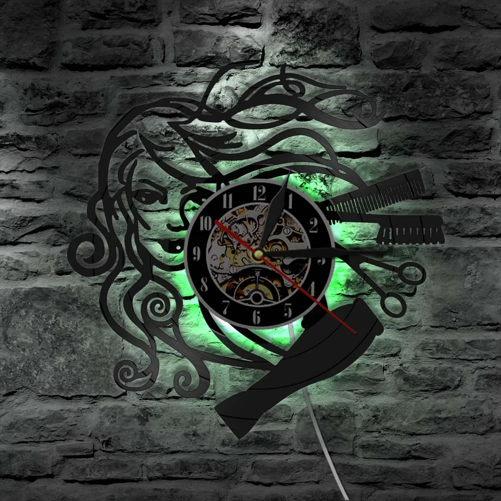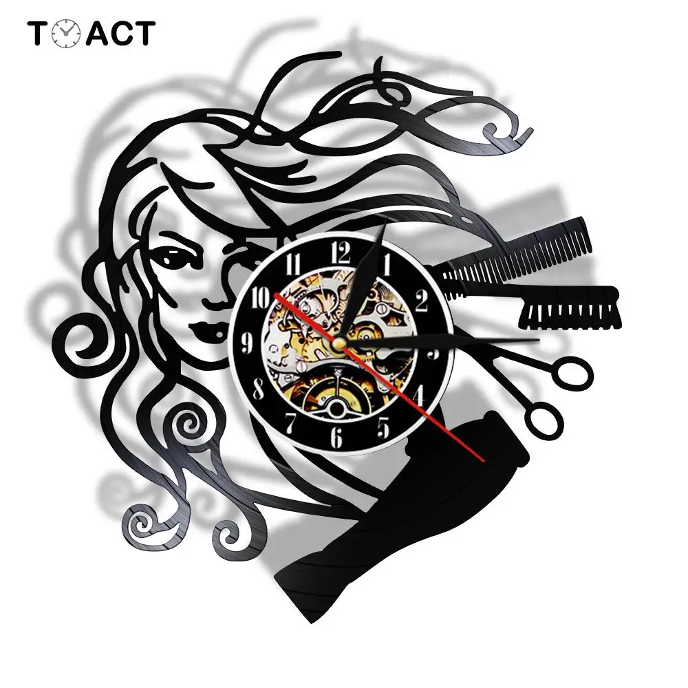 Барбершоп виниловая запись светодиодный настенные часы современный дизайн Висячие парикмахерские настенные часы для прически салон красоты reloj де сравнению