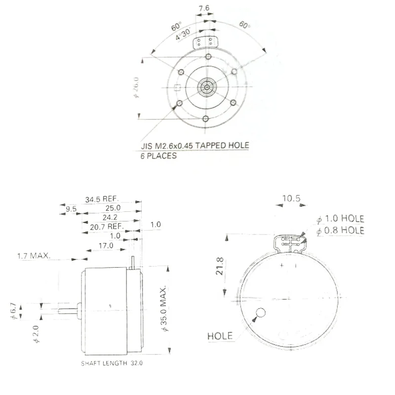 ① The model of the motor: 530 DC Motor For Recorder ② The voltages that can be selected for this motor are: DC 6V; DC 9V; DC 12V; ③ The rotation direction of this motor has CW or CCW for you to choose ④ The no-load speed of this motor is 2400RPM (plus and minus 10% fluctuation) ⑤ The torque of the motor is 8 g.cm ⑥ The diameter of the motor shaft is 2mm; for other dimensions of the motor, please see the following dimension drawing, thanks! ⑦ CW means clockwise rotation; CCW means counterclockwise rotation ⑧ If you want to buy this motor to replace your old motor, we recommend that you check the size of the old motor and compare it with our motor, so as to prevent purchase errors.Thanks for your support!