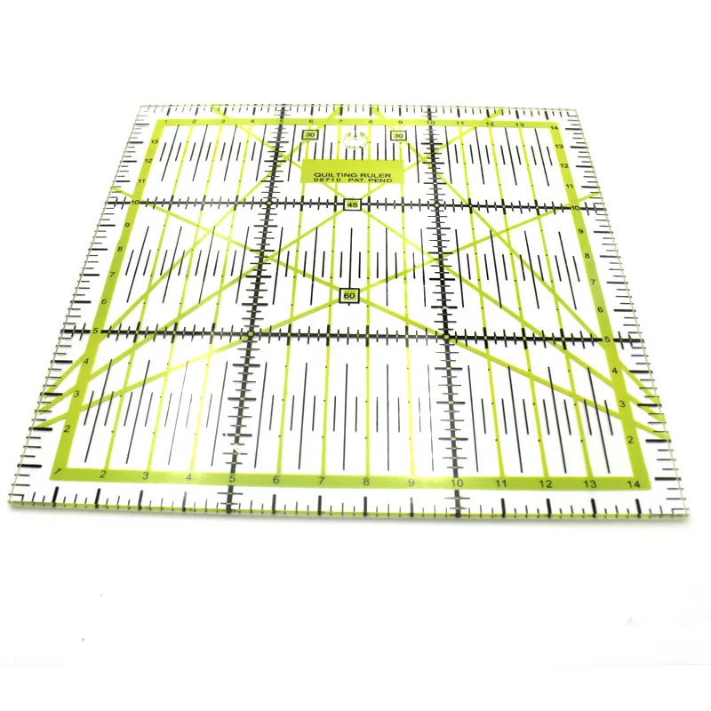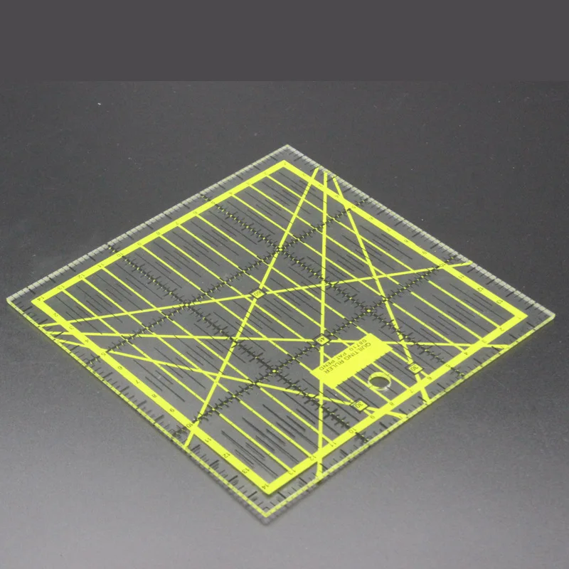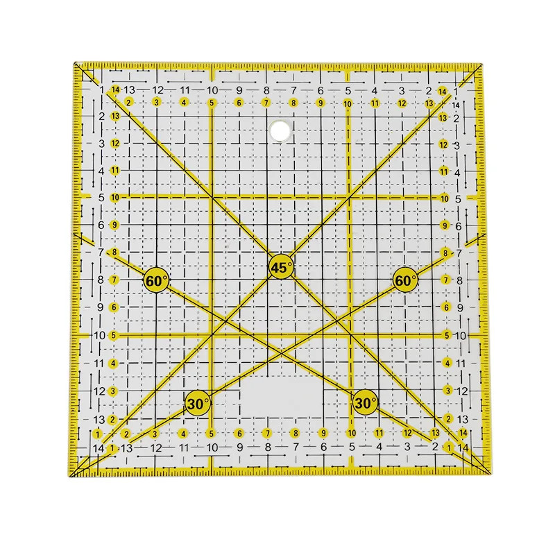 Спецификация: 15*15 см, толщина около 3 мм Материал: прозрачный акриловый материал, изысканный процесс печати, легко выцветает Угол: 30 °, 45 °, 60 °, 90 ° Применение: измерение, рисование, инструмент для припуска швов, может использоваться с режущего ножа в качестве режущей линейки