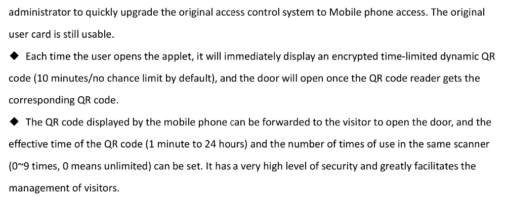 Владельцу не нужно брать с собой карту/ключ при выходе. Просто возьмите мобильный телефон. При вводе на дверь, дисплей 10 минутах езды в силе QR код, просто нажав на WeChat апплет, а затем положите телефон экрана рядом с считывающая головка. После этого дверь открывается.