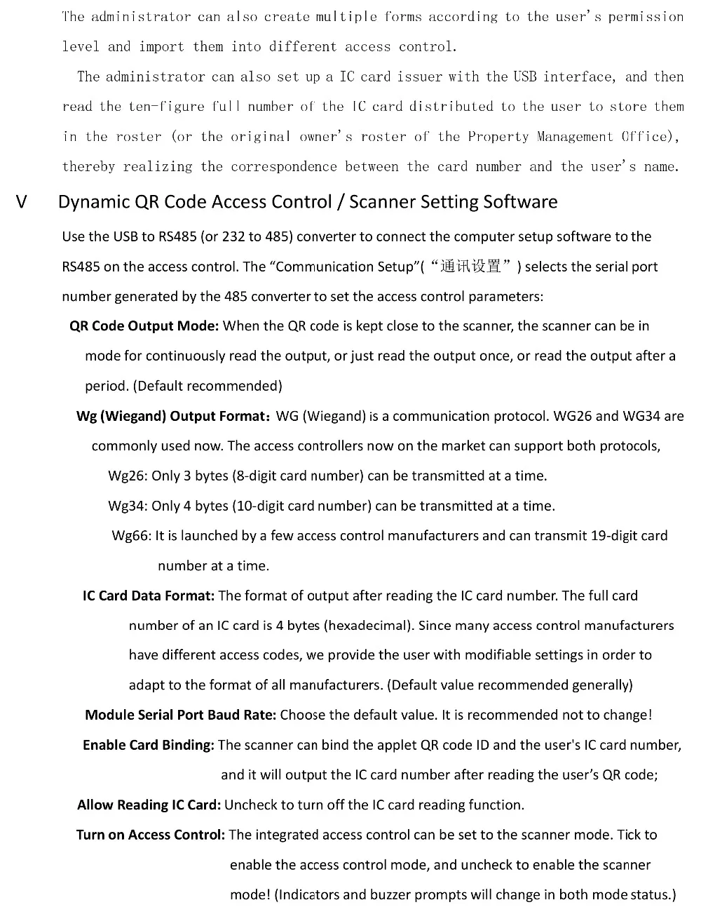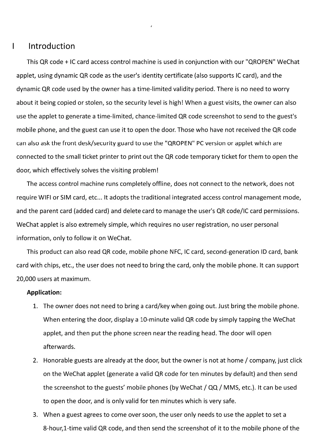 Устройство контроля доступа работает полностью в автономном режиме, не подключается к сети, не требует Wi-Fi или sim-карты и т. д. Он принимает традиционный интегрированный режим управления доступом и материнскую карту (добавленную карту) и удаляет карту, чтобы управлять qr-кодом пользователя/картами IC. Апплет WeChat также чрезвычайно прост, что не требует регистрации пользователя, личной информации пользователя, только для того, чтобы следовать за ним на WeChat.