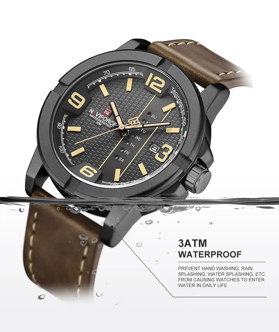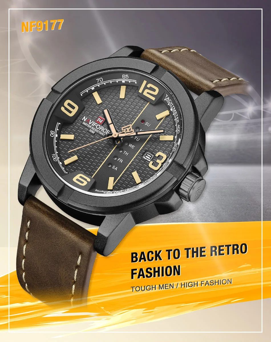 Model: NAVIFORCE NF9177 Movement:Quartz Movement Dial Diameter: 45mm Case Thickness: 12mm Band Length: 260mm Band Width: 23mm Product Weight: 70g Clasp Type: Buckle/ hook buckle Feature:Time, 30M Water Resistant,Date Week Display