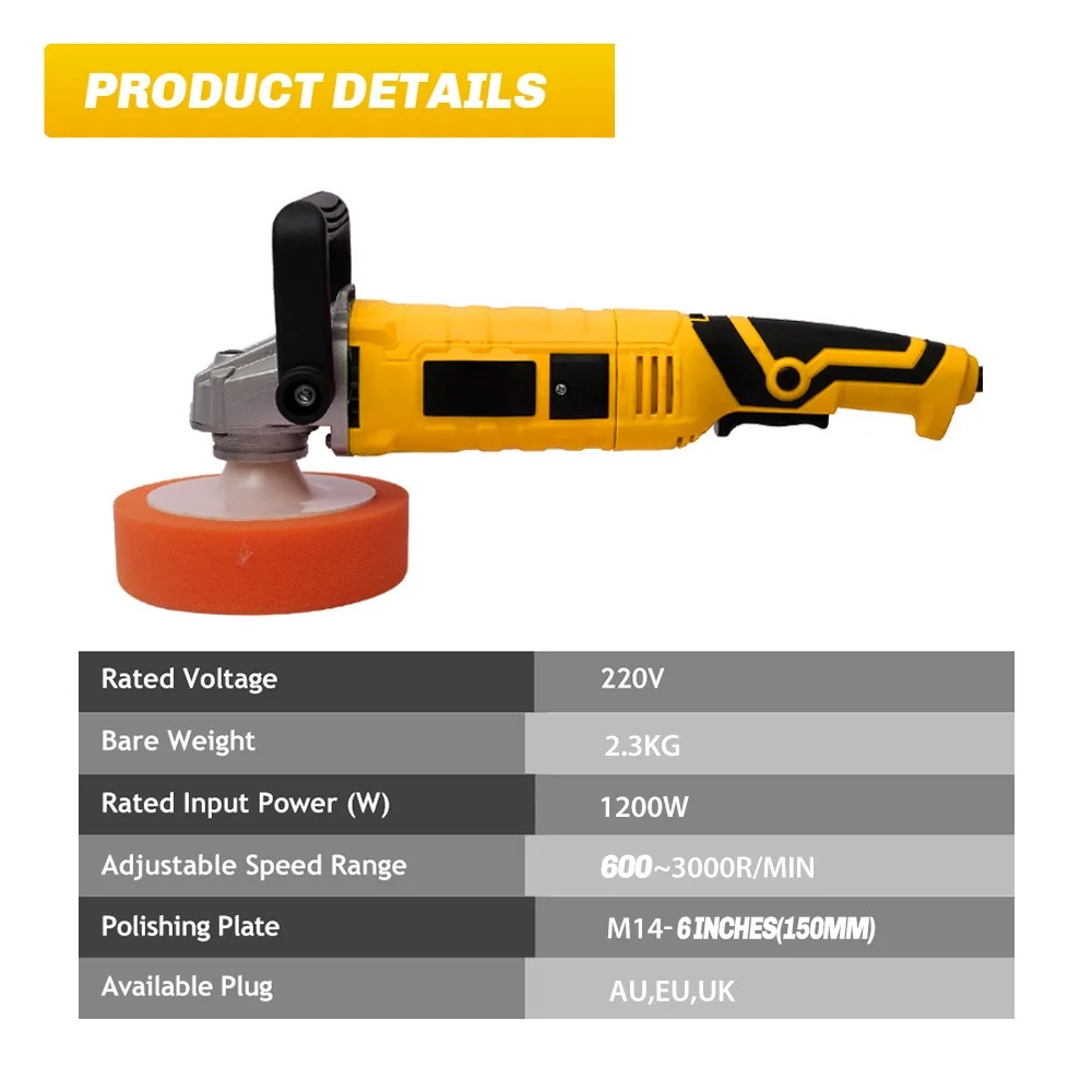 Материал: АБС-пластик Цвет: черный + оранжевый Мощность: 1200W Напряжение: 220V Регулируемая скорость: 7 передач регулируется (500/1000/1500/2000/2500/3000 об/мин) Скорость вращения: 500-3300р/мин Диаметр диска: 150 мм/5,9 дюйма Длина кабеля: 2 м Размер полировщика: 410*150 мм/16,1*5,9 дюйма Посылка Размер: 445*160*160 мм/17,5*6,3 * 6.3in Посылка Вес: 2950 г/6.5lb