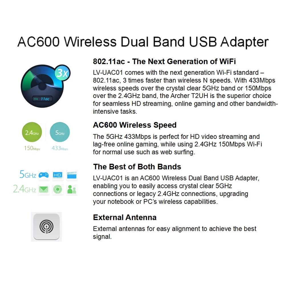 Поддерживает 802.11ac стандарт-следующее поколение Wi-Fi Обратная совместимость с 802,11 a/b/g/n продуктов Сверхбыстрый AC600 (433 + 150 Мбит) Скорость беспроводного соединения с 802.11ac 5dBi внешними антеннами обеспечивает еще лучше wirelress производительность Максимальная скорость передачи данных до 5 ГГц 433 Мбит/сек или 2,4 ГГц 150 Мбит/с Двухдиапазонные соединения для передачи hd-видео без задержек и игр Легкая wirelress безопасности шифрования при нажатии кнопки WPS Поддерживает windows 8,1/8/7/XP/32/64bit Важно: при правильной эксплуатации, не подключить wirelress USB адаптер к компьютеру, прежде чем вы установите программное обеспечение. Если вы делаете, дождитесь, пока нового оборудования экрана, чтобы отобразить и нажмите кнопку «отменить»; В противном случае процесс установки, вероятно, будет негативные последствия. Посылка включает в себя: 1 х беспроводной usb-адаптер 1 x CD драйвер