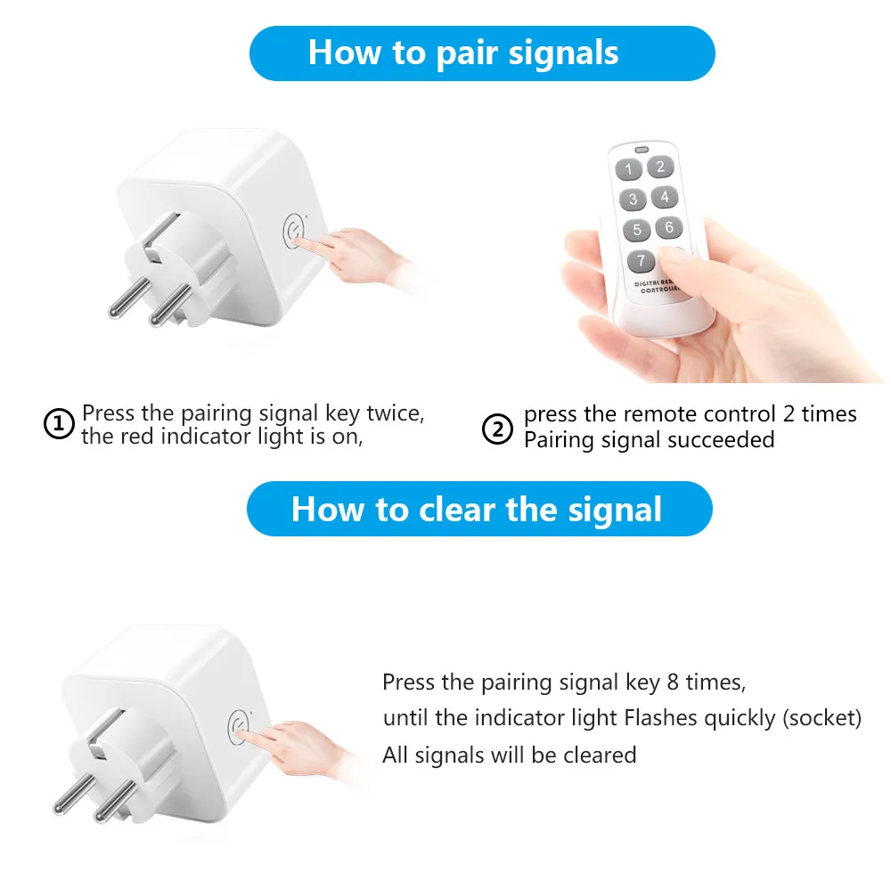 1. Нажмите клавишу сопряжения сигнала 8 раз, пока светильник не начнет мигать быстро (розетка) 2. Все сигналы будут очищены