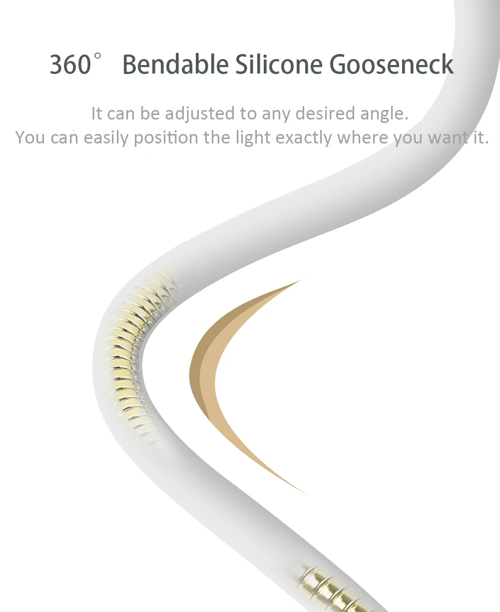 Мягкая гибкая силиконовая изогнутая форма 360 ° позволяет регулировать любой желаемый угол. Вы можете легко расположить светильник именно там, где он вам нужен.