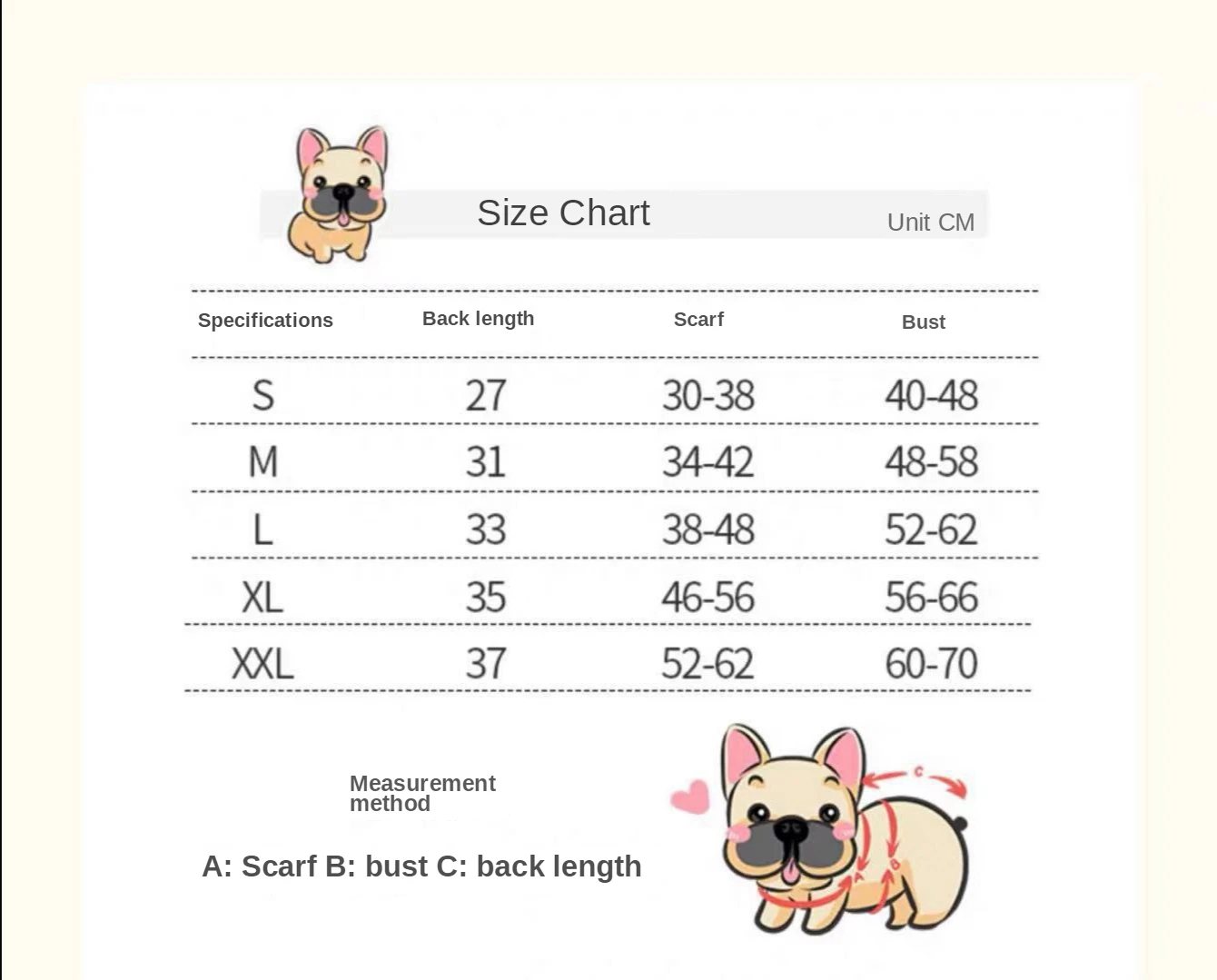 Тип изделия: зимняя одежда для домашних животных для маленьких кошек, собак, чихуахуа Материалы: ctoon Количество: 1 шт. Размеры: S,M,L,XL,XXL Характеристики: мягкий, теплый, Повседневный, Подходит: маленькие, средние кошки и собаки, например, чихуахуа, йоркширский терьер, французский бульдог, Тедди и т. д. Примечание: Пожалуйста, подтвердите, подходит ли размер для ваших питомцев, прежде чем заказывать. Полезный совет: -Возможно отклонение в 1-3 см, поскольку измерения выполнены вручную. -Цвет из-за различных мониторов и условий освещения, цвета могут немного отличаться от приведённых на фотографиях, пожалуйста, обратите внимание, спасибо.