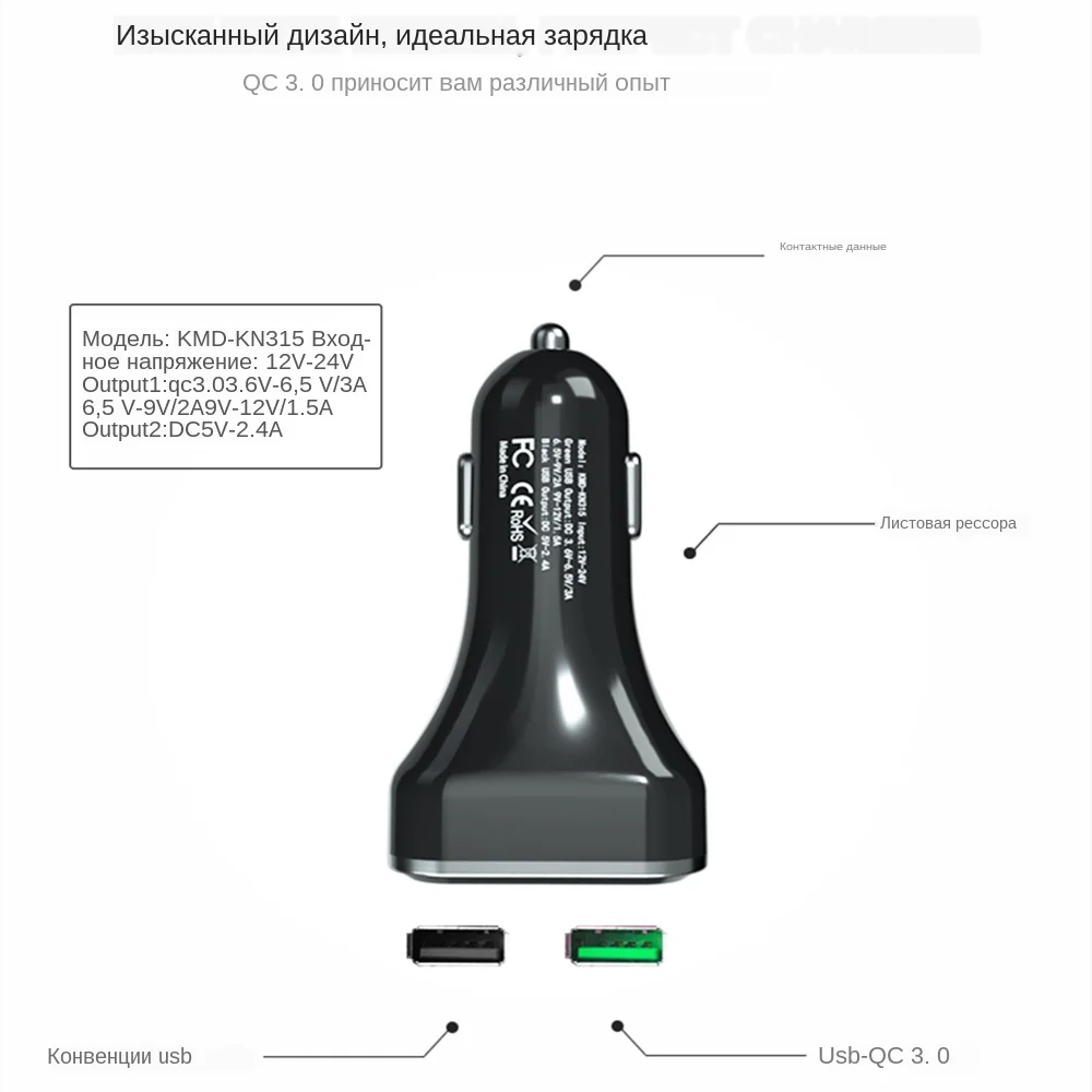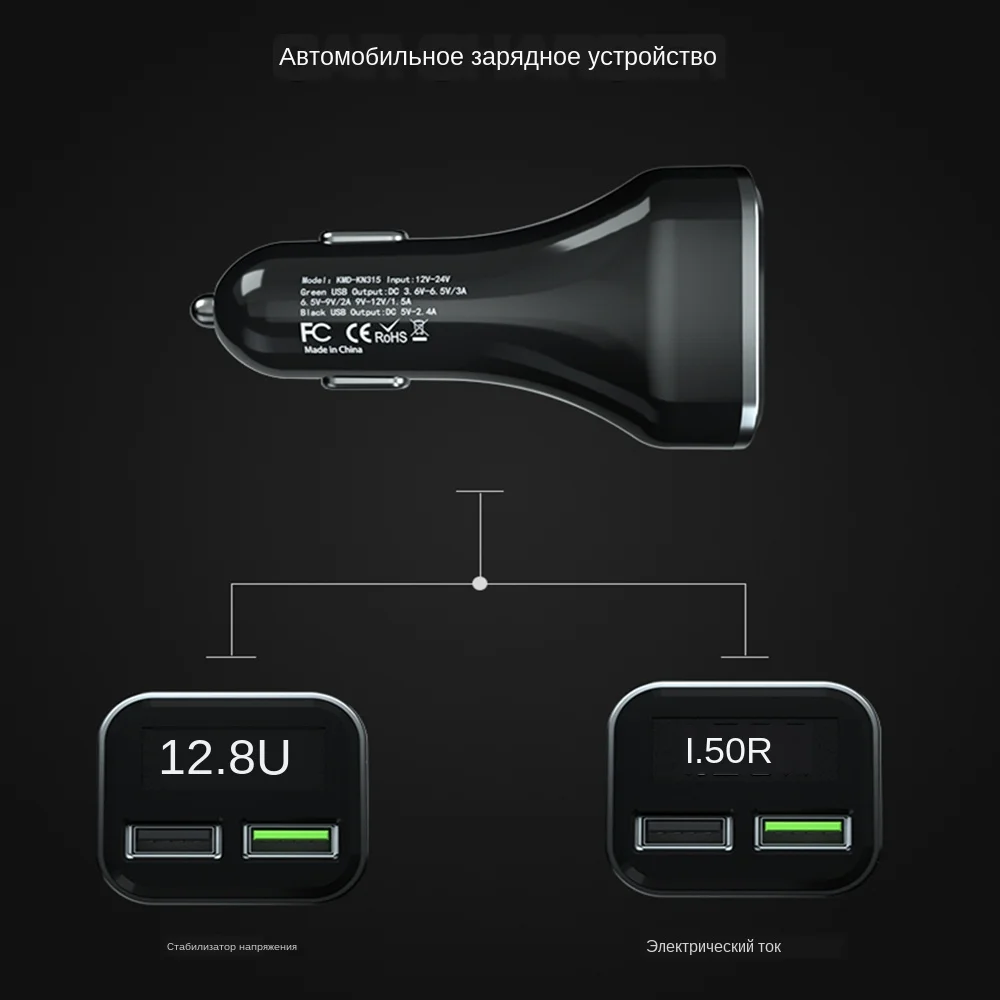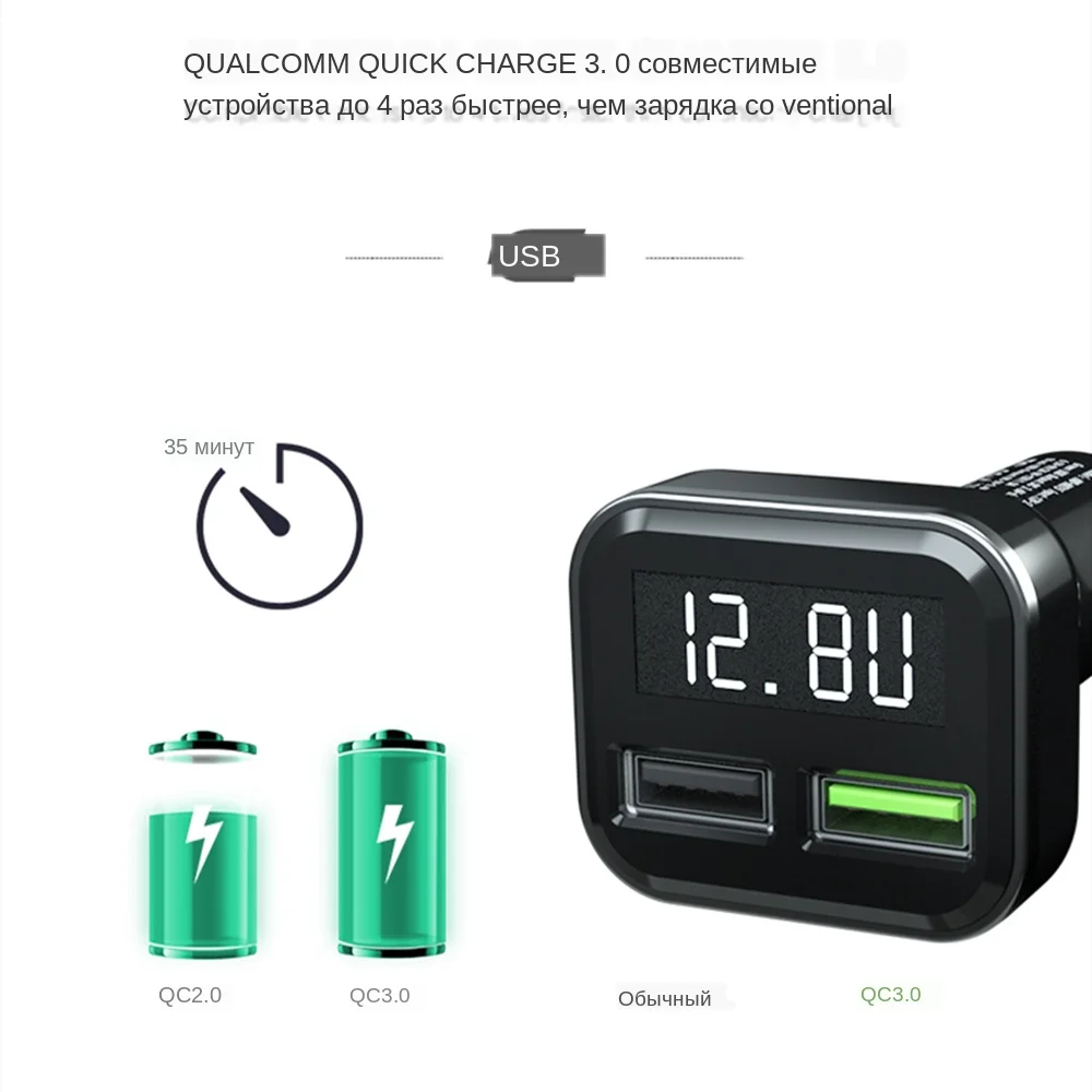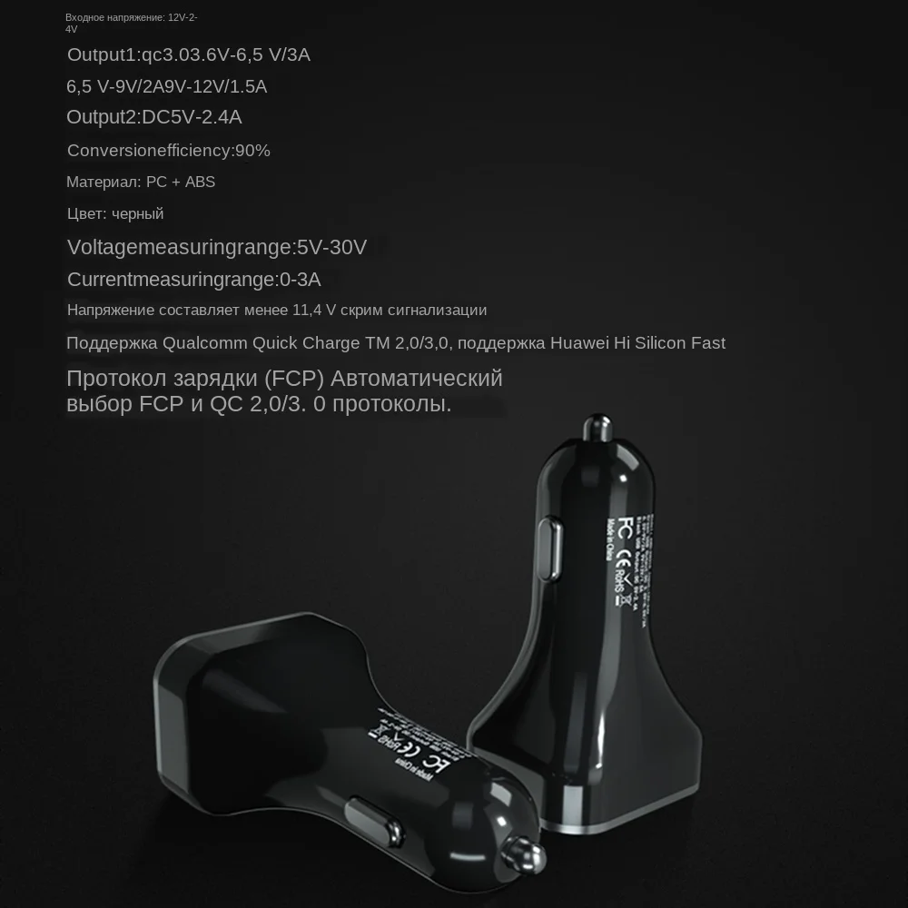 Название: цифровое автомобильное зарядное устройство Цвет: черный Модель: QC3.0 + 2.4A /QC3.0 + 3.1A QC3.0 + 2.4A: Материал корпуса: ПК, Общая мощность: 30 Вт (макс.) USB (QC3.0) Выход: 3,6-6 в/3 А 6-9 В/2 а 9-12 В/1,5 А (макс.) поддержка: QC3.0/2,0, HUAWEI:FCP/SCP samsung AFC Характеристики: 1, светодиодный дисплей, автомобильное напряжение батареи, мобильный телефон, зарядное напряжение, зарядный ток, мониторинг 2, двойной USB интерфейс питания в то же время 3, металлический эластичный контактный дизайн, подходит для прикуривателя разных размеров, Он может переносить 12 В/24 В широкий вход напряжения и совместим с большинства моделей на рынке. 4, совместим с широким подходом, смарт-адаптер, мобильный телефон, Bluetooth и планшет, во время встреч с основной и вспомогательный привод, зарядка: цифровое автомобильное зарядное устройство * 1