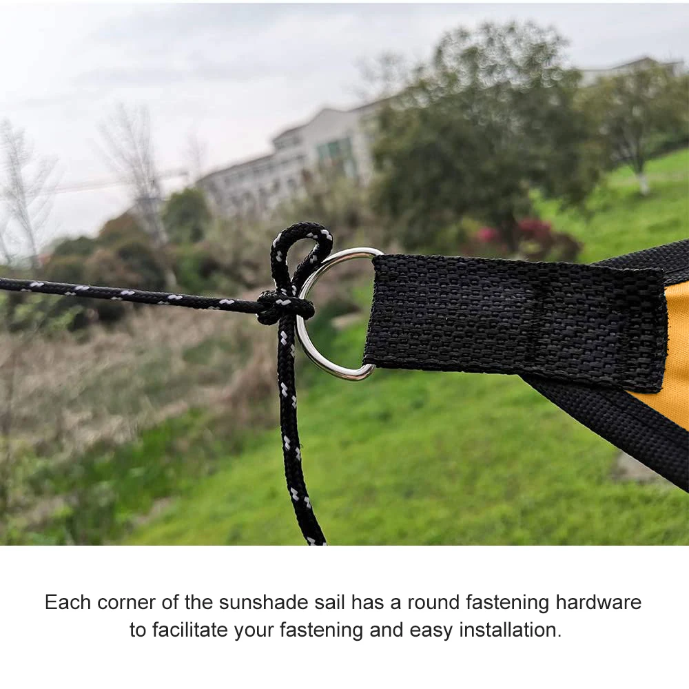 3. Каждый уголок теневого паруса имеет фиксированную металлическую круглую пряжку, чтобы вы могли завязать веревку и зафиксировать ее, и ее легко установить.