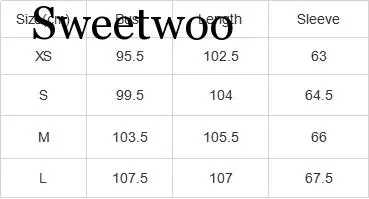 Размер (см) Обхват груди Длина Рукава XS 95,5 102,5 63 S 99,5 104 64,5 М 103,5 105,5 66 L 107,5 107 67,5