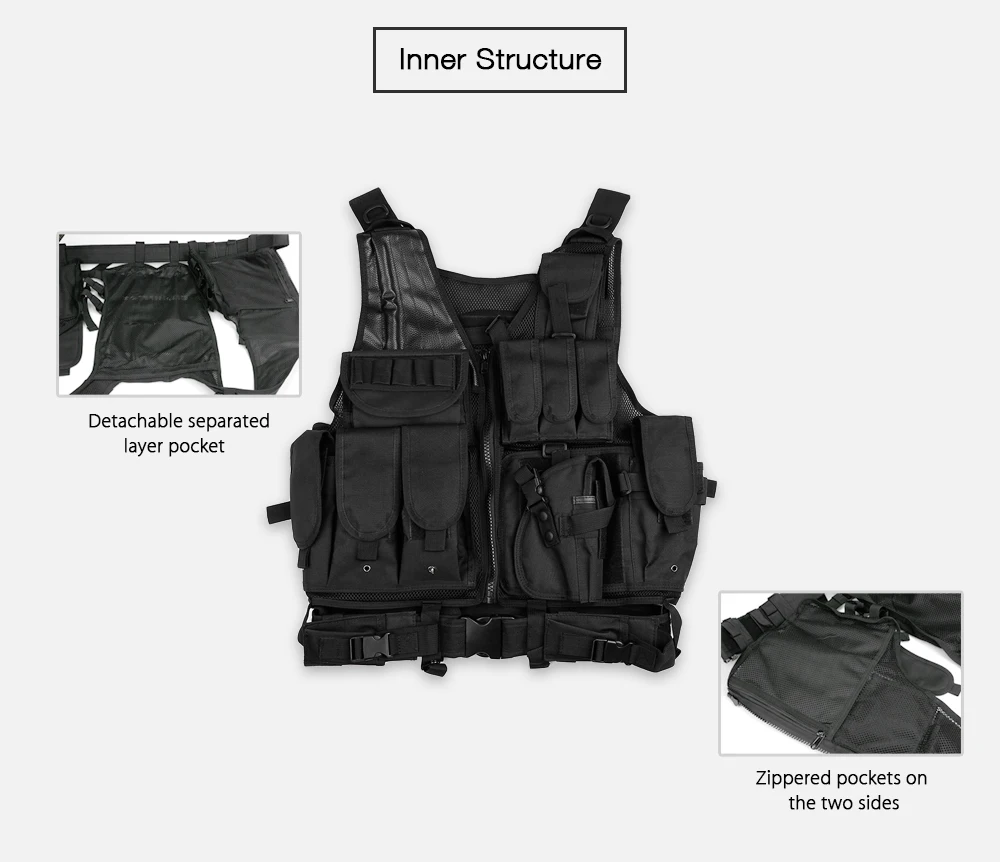 -Регулируемые Волшебные Ленты: часть талии принимает волшебную ленту и дизайн пряжки, которая позволяет носить и снимать этот тактический жилет быстро и удобно, одна большая волшебная лента на спине, чтобы прикрепить дополнительные предметы