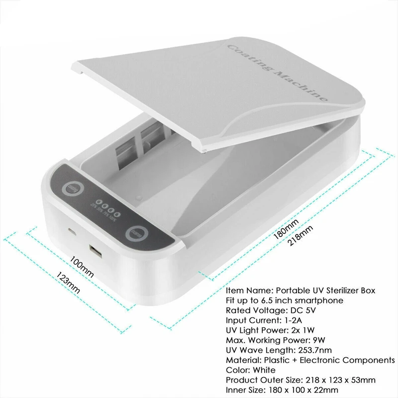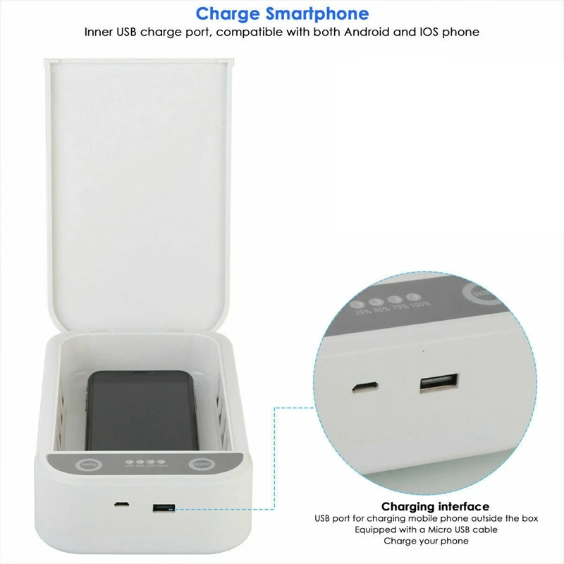 2. Широкая совместимость-этот стерилизатор может держать смартфон до 6,5 дюймов. Кроме мобильного телефона, он также может дезинфицировать маску для лица, ключи, ювелирные изделия, карты, кисти для макияжа и другие мелкие предметы. Идеальный подарок для себя и всех, кто заботится о гигиене.