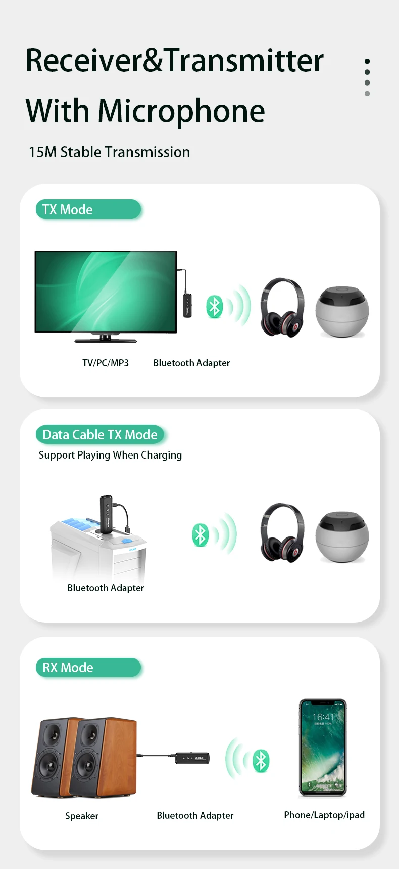 ZF-360B представляет собой Приемопередатчик Bluetooth разработаны с последней версии Bluetooth 5,0. Этот продукт может использоваться в качестве bluetooth-аудиопередатчика для беспроводной передачи звука телевизора и других аудиоисточников на bluetooth-гарнитуры или bluetooth-колонки (на компьютерах и в системе Android). Под, поддерживает прямая передача звука с жилам провода, без необходимости подключить устройство к 3,5 мм аудио кабель). Также его можно использовать в качестве bluetooth-аудиоприемника, чтобы моментально превратить проводной динамик в bluetooth-динамик, избавляя вас от оков кабеля и получая удовольствие от беспроводной музыки.