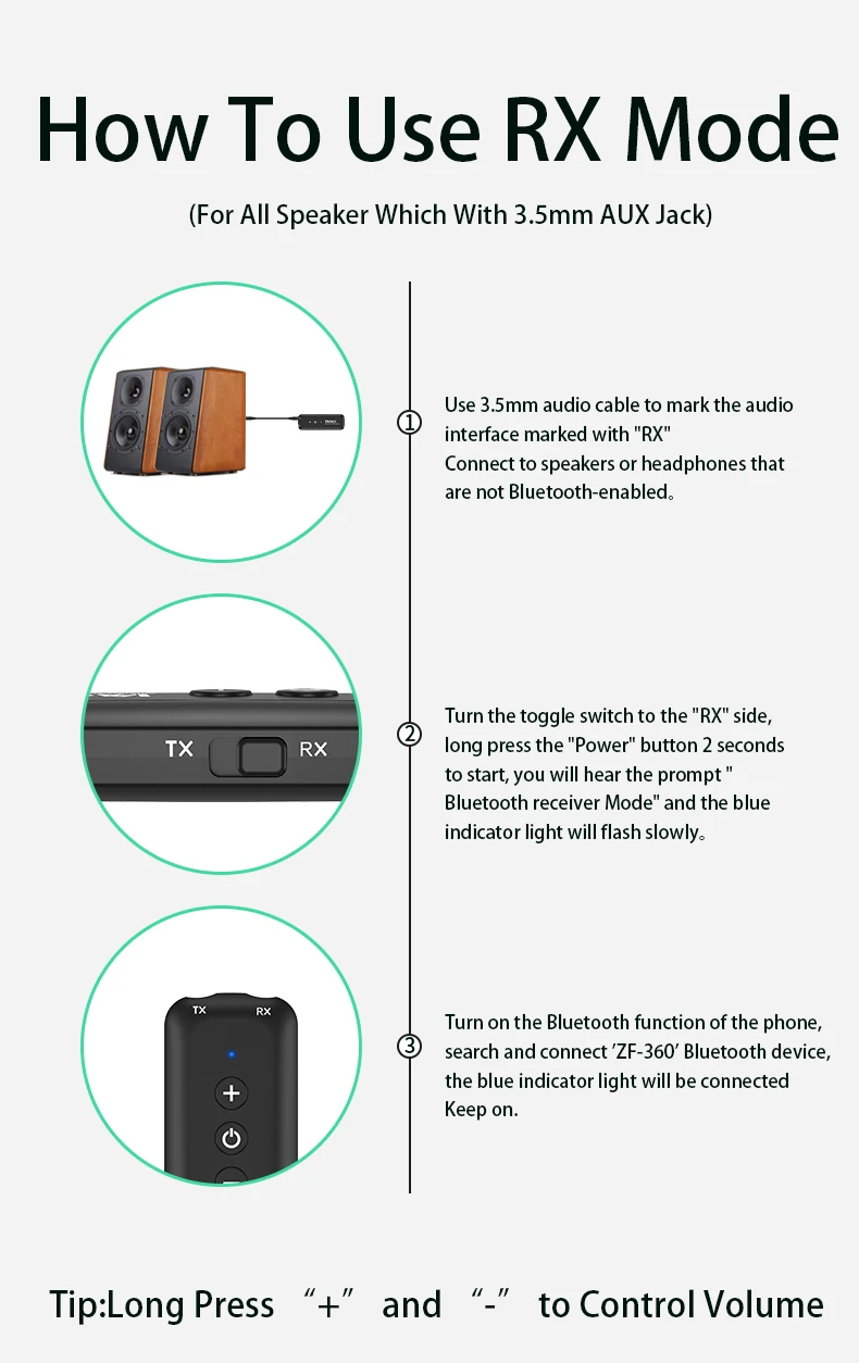 1) Режим передатчика A) извещение о подсоединении аудиоинтерфейс отмечен 'tx' к audiosource устройств (ТВ, компьютер, радио, MP3 и т. д.) с 3,5 мм аудио-кабель. B) повернуть Тумблер для 'tx' сбоку, нажмите и удерживайте кнопку «силовой» кнопку питания в течение 2 секунд, чтобы начать, и красный индикатор светильник будет медленно мигает. В) Включите устройство приема Bluetooth, к которому вы хотите подключиться, и вокните в режим сопряжения Bluetooth. Адаптер будет автоматически сопряжение с ним, и красный индикатор светильник будет оставаться на экране после подключения. Примечание: кнопки «+»-«-» и «power» в этом режиме недопустимы. 2) Режим передатчика ПК A) Подключите usb-порт для зарядки и usb-порт для компьютера к usb-кабелю для передачи данных. B) повернуть тумблер на 'tx' сбоку, нажмите и удерживайте кнопку «силовой» кнопку питания в течение 2 секунд, чтобы начать, и красный индикатор светильник будет медленно мигает. В) Включите устройство приема Bluetooth, с которым вы хотите подключиться, и в режим сопряжения Bluetooth. Адаптер будет автоматически сопряжение с ним, и красный индикатор светильник будет оставаться на экране после подключения. Примечание: кнопка «+»: следующий трек (нажатие), просто можно управлять музыкальным проигрывателем; Кнопка «-»: Предыдущий трек (нажатие), просто можно управлять музыкальным проигрывателем; Кнопка «Пауэрс»: пауза/возобновление музыки (нажатие), можно управлять музыкальным проигрывателем. (В этом режиме кнопка «+»-«-» не может регулировать громкость компьютерной системы.) 3) Режим приемника A) извещение о подсоединении аудиоинтерфейс отмечен 'rx' для unbluetooth с поддержкой динамик или гарнитура с 3,5 мм аудио-кабель. B) повернуть тумблер на 'rx' сбоку, нажмите и удерживайте кнопку «силовой» кнопку питания в течение 2 секунд, чтобы начать, и вы услышите подскажите bluetooth телефона приемник режим, и синий индикатор светильник будет медленно мигает. C) Включите телефон с функцией Bluetooth, поиск и подключиться к bluetooth-устройство под названием 'zf-360», и синий индикатор светильник будет оставаться на экране после подключения. Примечание: кнопка «+»: следующий трек (нажмите), Увеличение громкости (нажмите и удерживайте); Кнопка «-»: предыдущий вызов (нажмите), уменьшение громкости (нажмите и удерживайте); кнопка «Питание»: пауза/возобновление музыки (нажмите). 4) Режим приемника с микрофоном, громкая связь. (режим TX не поддерживает)