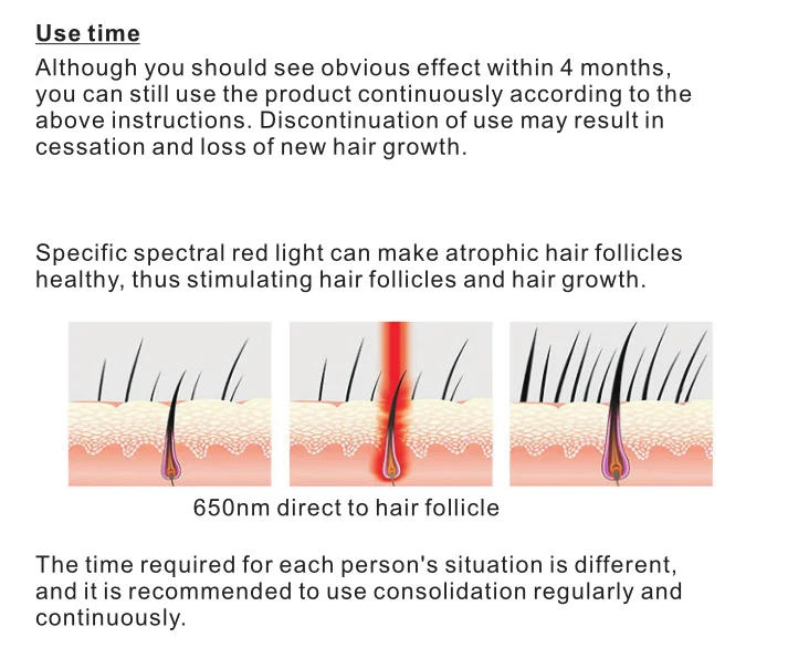 Инструмент для восстановления волос использует лазер длиной волны 650 нм, он также называет холодный лазер или слабый лазер. Этот лазер не наносит вреда ткани человека, но он наносит вред сетчатке человека, поэтому, пожалуйста, не смотрите прямо в лазер. Перед использованием ознакомьтесь со всеми инструкциями в соответствии с руководством пользователя.