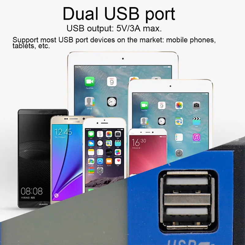 -Двойной usb-порт: выход USB: 5 В/3 А макс., двойной USB источник питания для двух мобильных телефонов, планшетных ПК и других устройств.