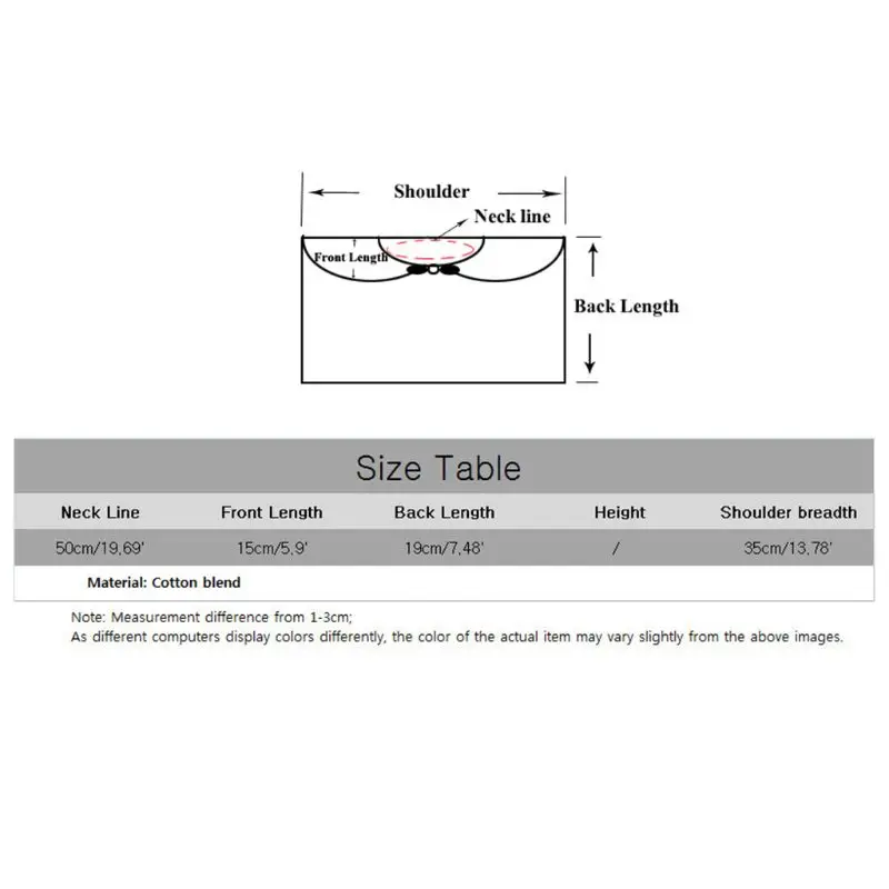 Размер: линия шеи: 50 см/19,69 дюйма, длина передней части: 15 см/5,9 дюйма, длина задней части: 19 см/7,48 дюйма, ширина плеч: 35 см/13,78 дюйма