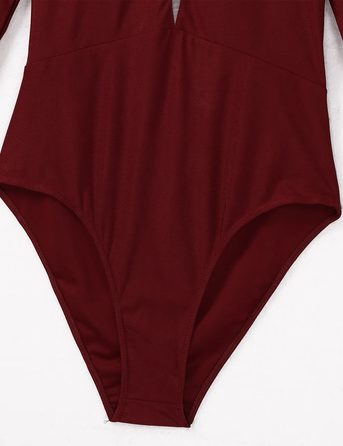 Круглый вырез и длинные рукава, открытая спина с перекрученными бретелями, прозрачная сетка телесного цвета, вставленная на лифе.