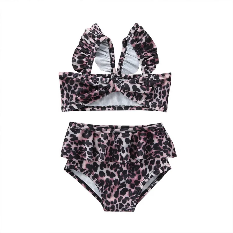 Новинка; Купальные костюмы для девочек; Летний пляжный купальник с леопардовым принтом и оборками; Раздельный купальник