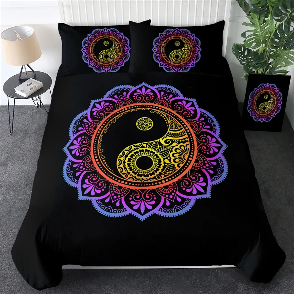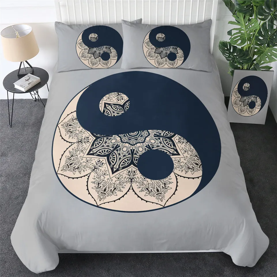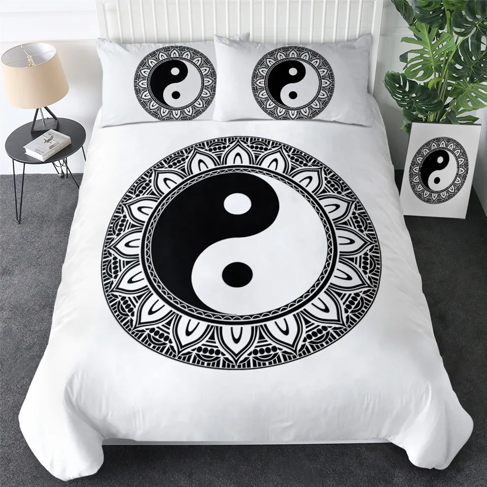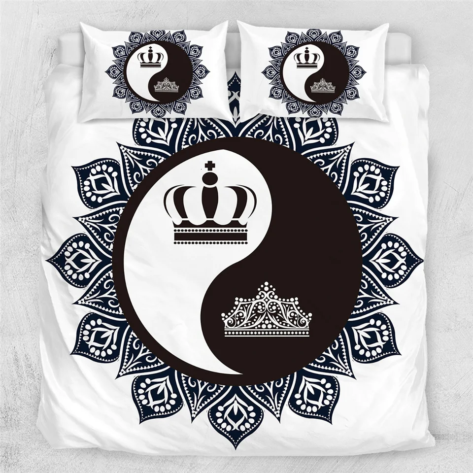 Item Name:Bedding SetPacking List:1* Duvet Cover + 2* Pillow CasesFabric:PolyesterSeason:Spring, Summer, Autumn, WinterFeatures:Tai Chi diagram of flower design with king and queen corwn, simply change your bedroom style.
