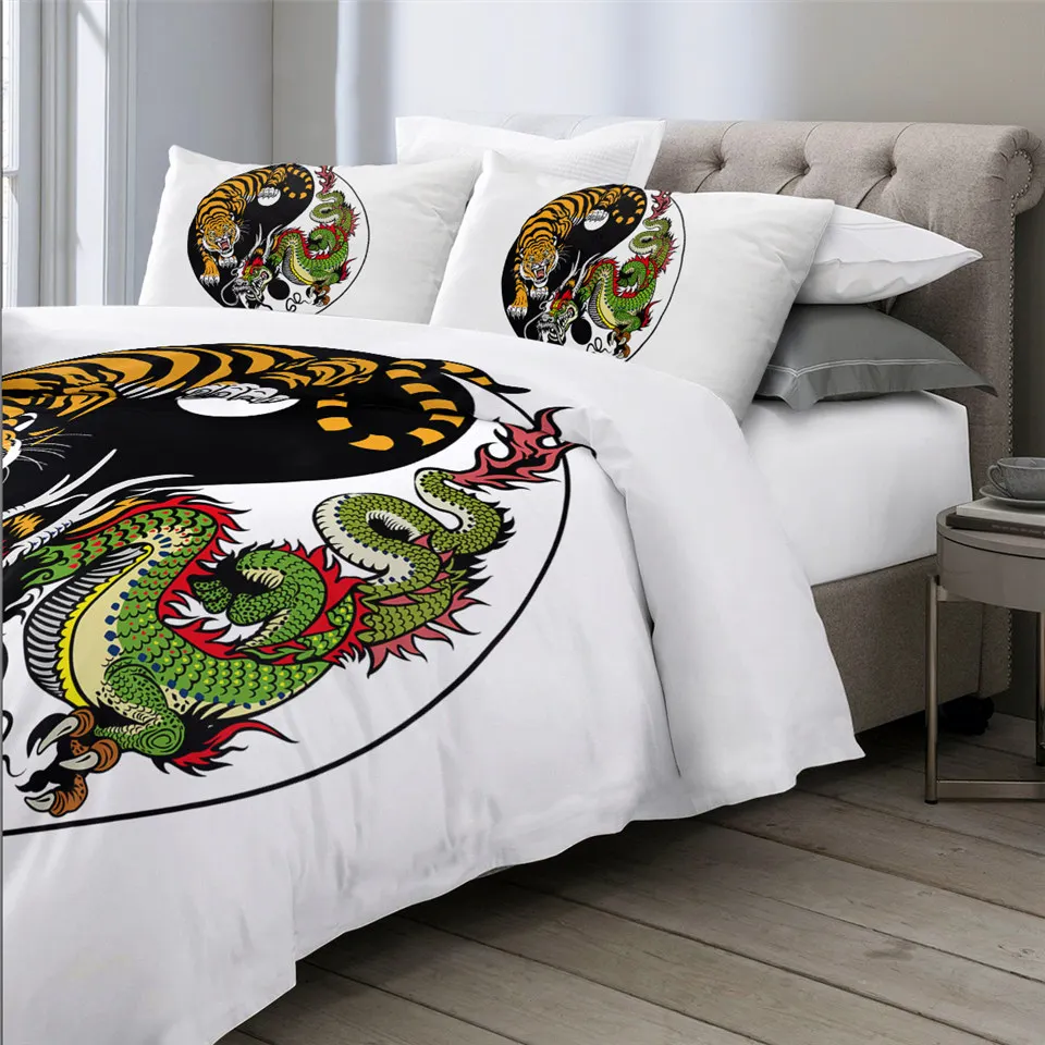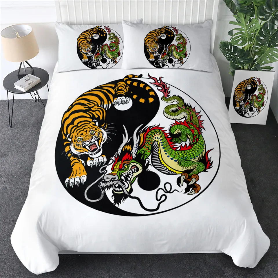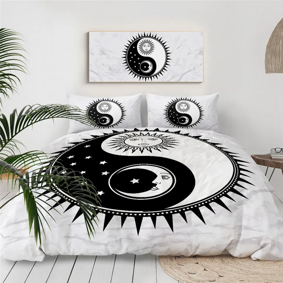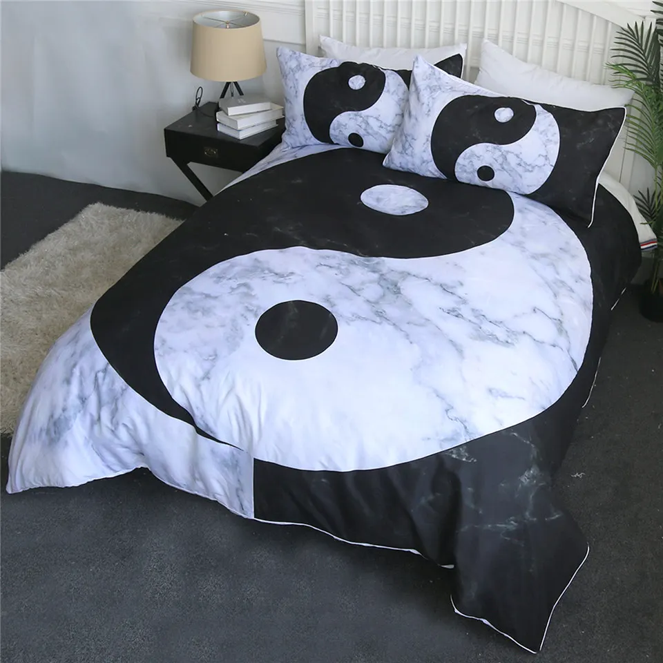 Item Name:Bedding SetPacking List:1* Duvet Cover + 2* Pillow CasesFabric:PolyesterSeason:Spring, Summer, Autumn, WinterFeatures:Tai Chi diagram of flower design with king and queen corwn, simply change your bedroom style.