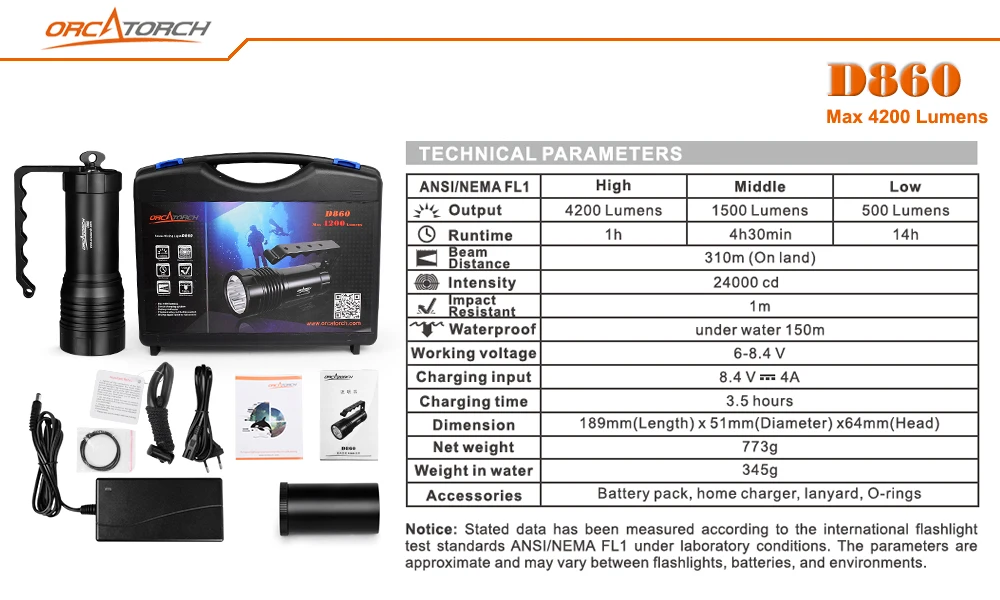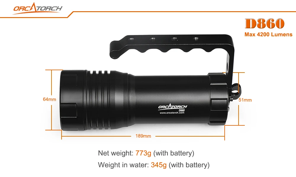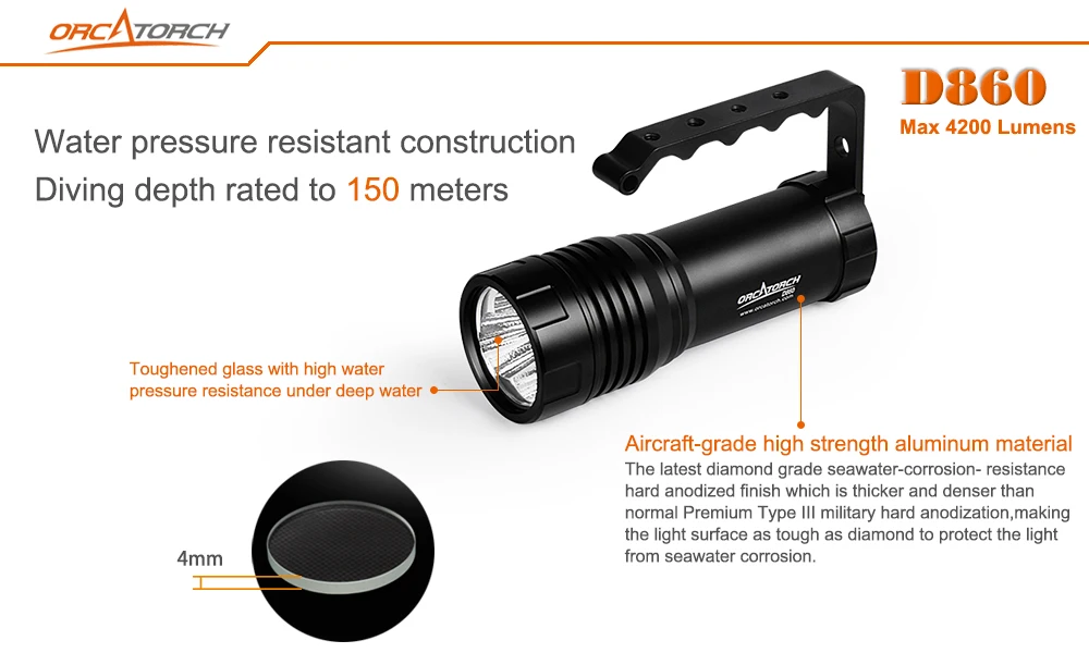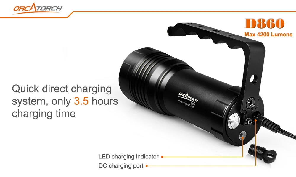 OrcaTorch D860-это высокопроизводительный погружной светильник с функцией прямой зарядки. Питание от трех светодиодов Cree может достигать максимум 4200 люменов. С функцией прямой зарядки светильник можно заряжать, не вынимая аккумулятор. Индикатор заряда батареи позволяет мгновенно узнать оставшийся уровень заряда батареи. Уникальный дизайн хвостовой кнопки из титанового сплава, с его функцией блокировки, может идеально избежать случайного использования. Более того, ручка со специальными отверстиями позволяет легко прикрепить светильник к различным устройствам.