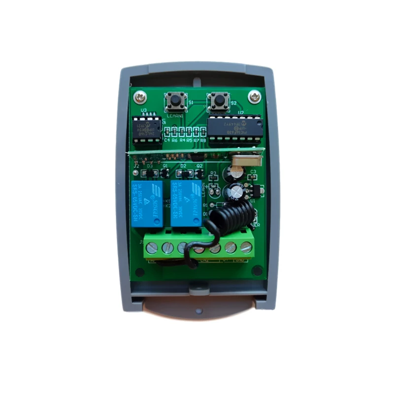 Как программировать Мгновенная рабочая модель: 1. Коды обучающего передатчика: Нажмите «learn 1» или «learn 2» в течение 1 секунды, светильник learn_led, затем, нажмите кнопку, которую вы выбираете на передатчике до вспышки «learn_led» и выйдите, код передатчика сохранен. • Повторите вышеуказанные действия для других передатчиков. 2. Стирание кодов передатчика: Нажмите «learn 1» или «learn2» и удерживайте кнопку «learn_led светильник до выхода, Узнайте 1, чтобы удалить канал 1 Узнайте 2, чтобы удалить канал 2