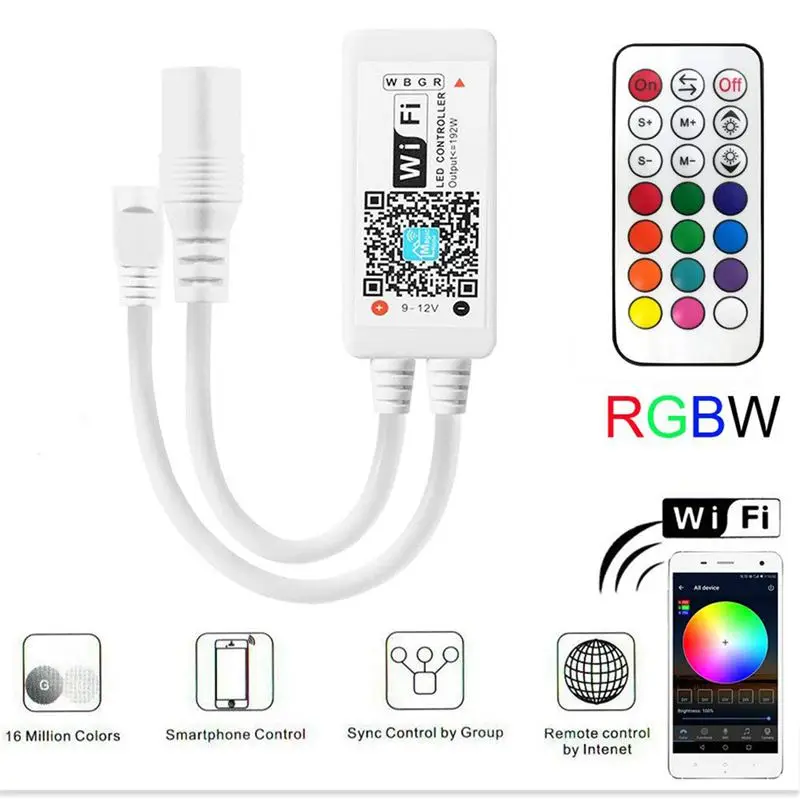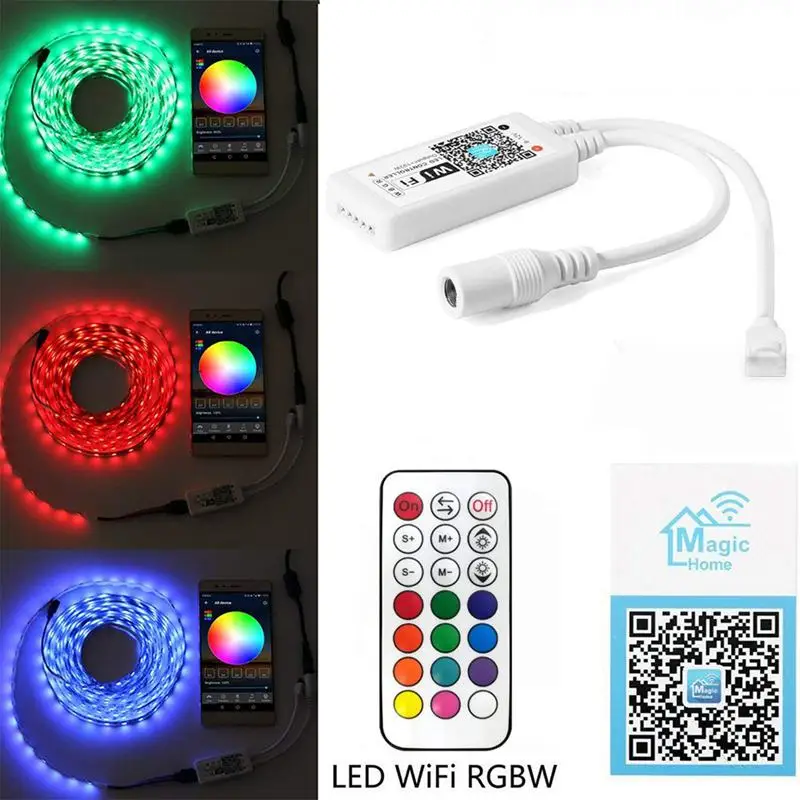 Мини wifi rgbw контроль ler + RF 21 ключ пульт дистанционного управления ler: поддержка 16 миллионов контроль цвета и регулировка яркости. Поддерживает настройку цвета и экономит. Функция управления группой, отрегулируйте светильник. Светильник и синхронизация музыкального ритма. Сотни моделей на светильник и функции микрофона. Камера имеет функцию цвета фона. Пульт дистанционного управления. Расстояние распространения составляет приблизительно 30 метров выше среднего контроллера