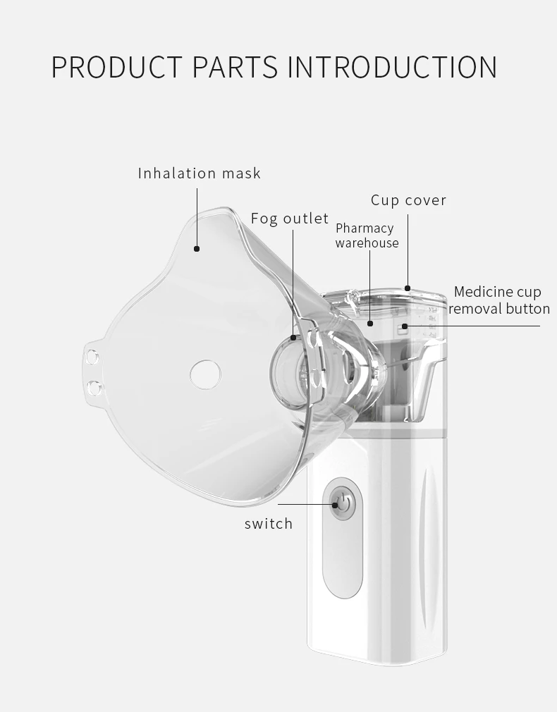 Посылка включает в себя: 1 х Объем резервуара для лекарственных средств 2 маски (1 взрослый Тип, 1 детский тип) 1 х Мундштуки 1 x крышка для защиты от пыли USB кабель (1 шт.); Руководство по эксплуатации на английском языке-1 шт. Коробка-1 шт.