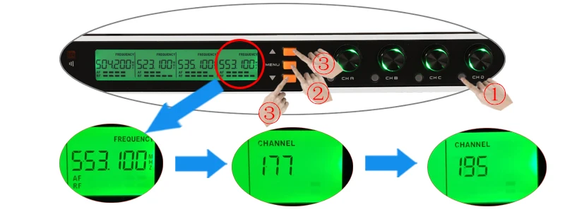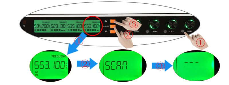 2. Приемник: 1) настройка частоты приемника. А. Автоматический выбор A. Нажмите кнопку канала, чтобы выбрать канал B.Нажмите «Меню» в течение одного времени, введите сканирование C. Нажмите «вверх» для автоматического выбора частоты.