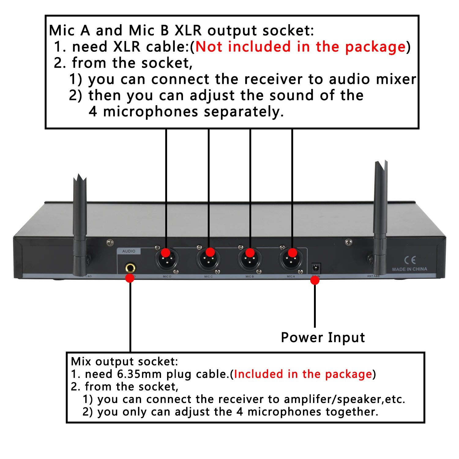 4) функция задней панели приемника: А. Разъем Mic A и Mic B XLR: A) нужен кабель XLR:(Не входит в посылка) Б). От розетки, 1) Вы можете связать приемник с аудиомиксером 2) затем вы можете управлять микрофоном A или микрофоном B отдельно. B. Смешанная розетка: A) нужно 6,35 мм штекер кабеля. (в комплекте в посылка) Б) от розетки, 1) Вы можете связать приемник с усилителем/динамиком и т. д. 2) вы можете управлять только микрофоном A и B вместе.