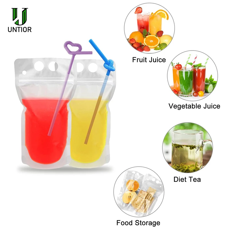 -Многофункциональные пакеты для напитков: наши пакеты для напитков с соломой могут легко хранить Редкие напитки, такие как чай, кофе, соки, алкогольные напитки, коктейли, вино и т. д. Мешки для сока также подходят для хранения продуктов питания, таких как бобы, закуски, конфеты, печенье, сухие цветы, орехи и так далее.