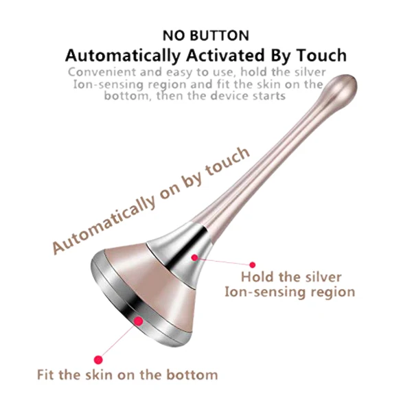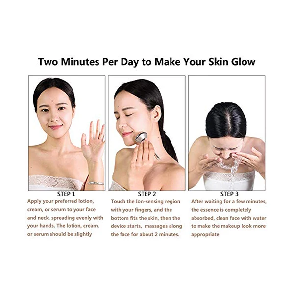 Контактируйте с серебряной ионно-чувствительной областью пальцами, и нижняя часть подходит для кожи, затем устройство начинается, массирует по лицу около 2 минут. (Он также может использоваться в других областях кожи, таких как шея, руки, нос и глаза для лучшего поглощения.)