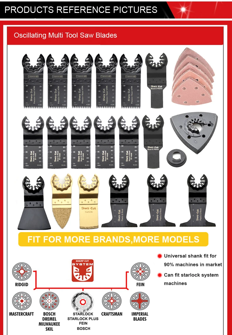 Список аксессуаров: 3 шт. 65 мм треугольные лезвия для дерева и пластика. 5 шт., 32 мм, биметаллические лезвия для мягкой резки металла. Японские лезвия для зубов, 5 шт., 32 мм, для быстрой и быстрой работы Точная резка древесины. 2 шт., лезвия из стали 65Mn для дерева и пластика, 20 мм Треугольное алмазное шлифовальное лезвие, 1 шт. 1 шт., прямые алмазные шлифовальные лезвия. 1 шт. скребок Песочная прокладка 1 шт. 25 шт., песочные бумаги 1 адаптер для ПК