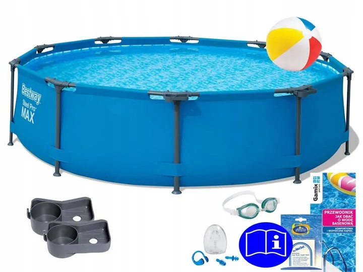1. БАССЕЙН - вместимостью 4 678 литров , размером 305х76 см . Производитель указывает максимальное содержание воды на уровне 90%. , 2. РУКОВОДСТВО - листовка «Как ухаживать за водой в бассейне» , безусловно, облегчит уход за водой в бассейне. Руководство содержит наиболее распространенные проблемы с водой и решения. Чрезвычайно полезное дополнение к проблемной воде. 3. ИНСТРУКЦИЯ RU - перед тем как разложить бассейн, обязательно прочитайте инструкцию по эксплуатации. Благодаря этому вы улучшите установку и избежите ненужных ошибок. 4. РЕМОНТНЫЙ КОМПЛЕКТ - содержит 6 ремонтных патчей в виде самоклеящихся наклеек для виниловых предметов. 5. НАДВИЖНОЙ ШАР - отличное, красочное дополнение к игре, любимое в основном детьми. Идеально подходит для игры всей семьей. 6. УШКИ И НОСЫ - благодаря этому гаджету, погружение в бассейн не доставит детям никаких проблем. Компактная и удобная упаковка для хранения и транспортировки в комплекте. 7. Подводные очки - они имеют простое регулирование окружности, что делает их универсальными для детей в возрасте 3-8 лет. Набор поставляется с одним предметом в случайно выбранном цвете. Они станут прекрасным дополнением к водному безумию. 8. Держатели для напитков - держатели прикреплены ко всем тройникам. Включает 2 ручки.