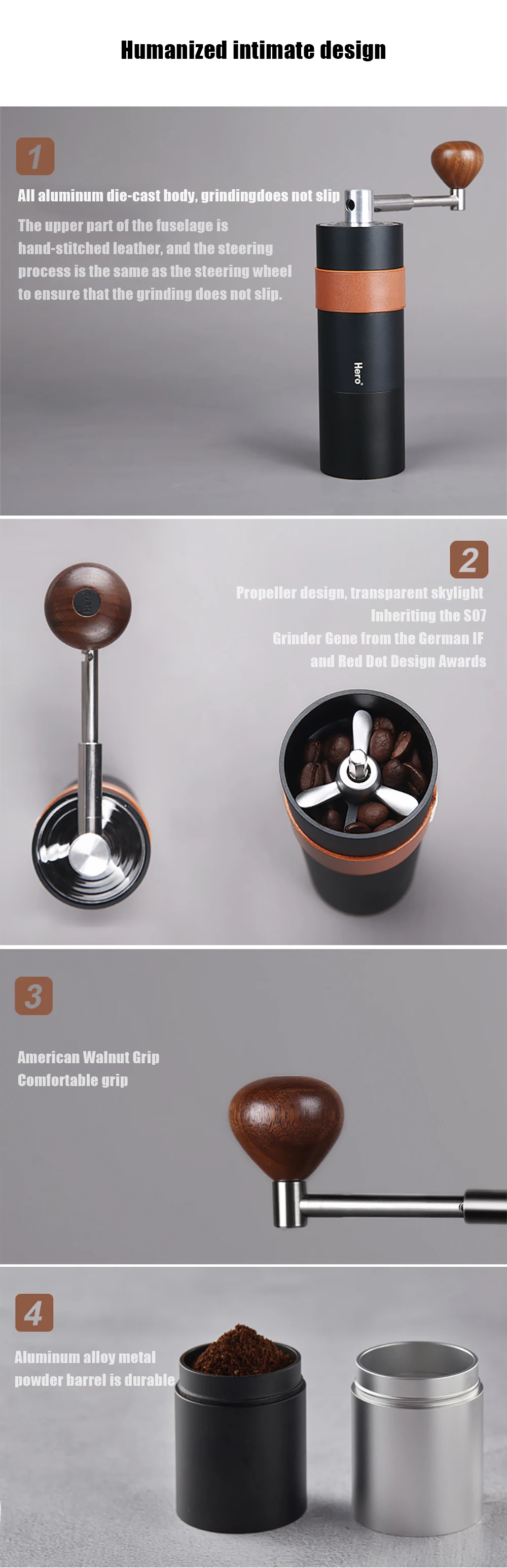 Торговая марка: Hero Материал: 304 Алюминиевый сплав из нержавеющей стали, Итальянский орех, шлифовальный сердечник из тонкой стали с ЧПУ Размер: высота 14,2 см длина ручки 14 см Ёмкость: 15 г
