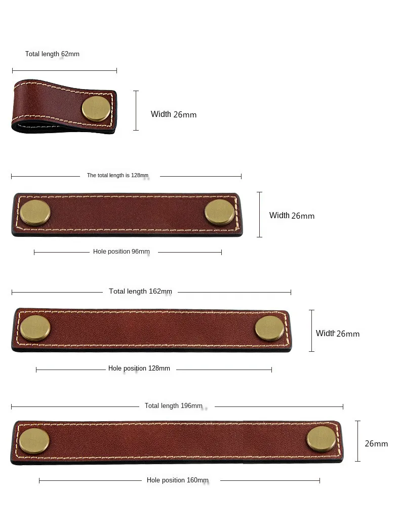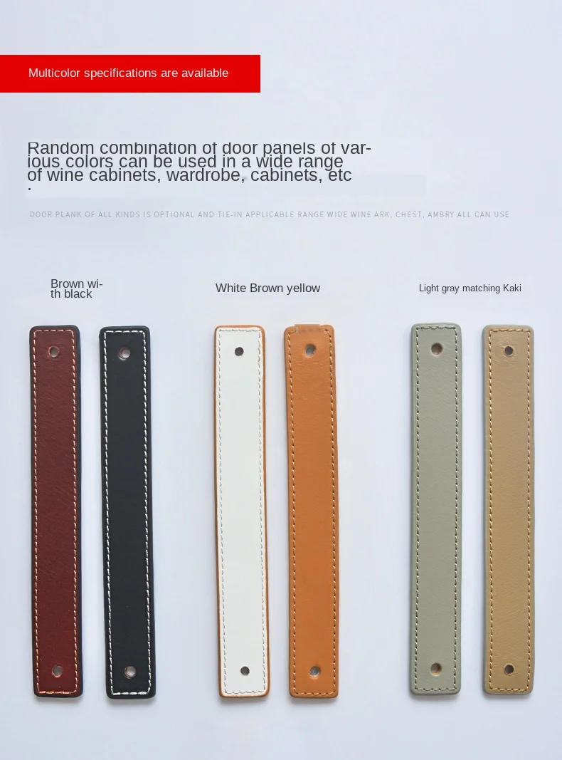 Цветные двухсторонние кожаные ручки (доступны с обеих сторон) Материал: коровья кожа + латунь Цвет кожи: серый и хаки/черный и коричневый/белый и хаки Цвет металлической головки: латунь, бронза Расстояние отверстия: одно отверстие/96 мм/128 мм/160 мм 1 шт. ручка + винт Применение: ручки ящика шкафа, ручки шкафа, дресс тянет, Мебельная ручка