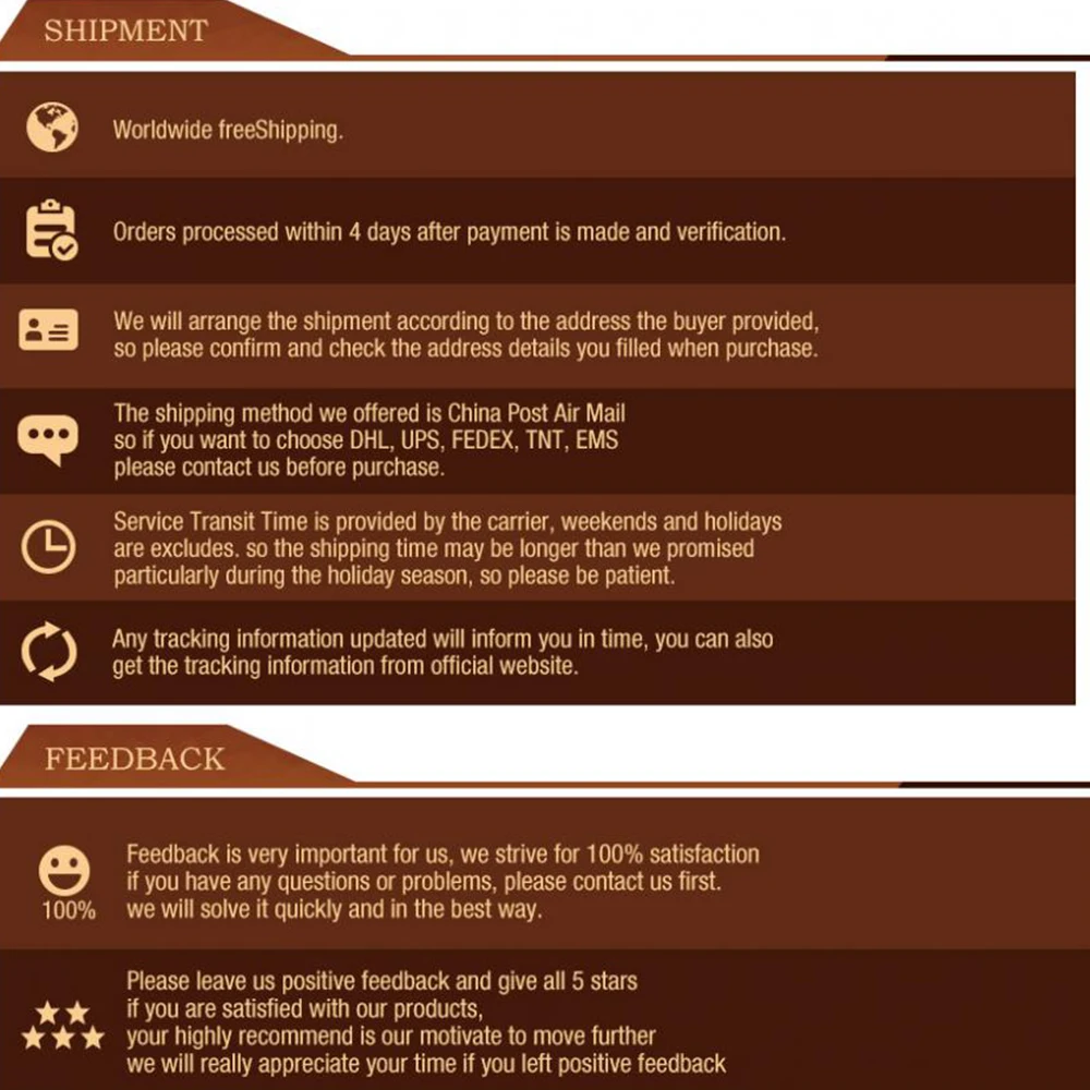 Все товары будут проверены и хорошо упакованы перед отправкой. Заказы будут отправлены в течение 2-5 рабочих дней после завершения оплаты.